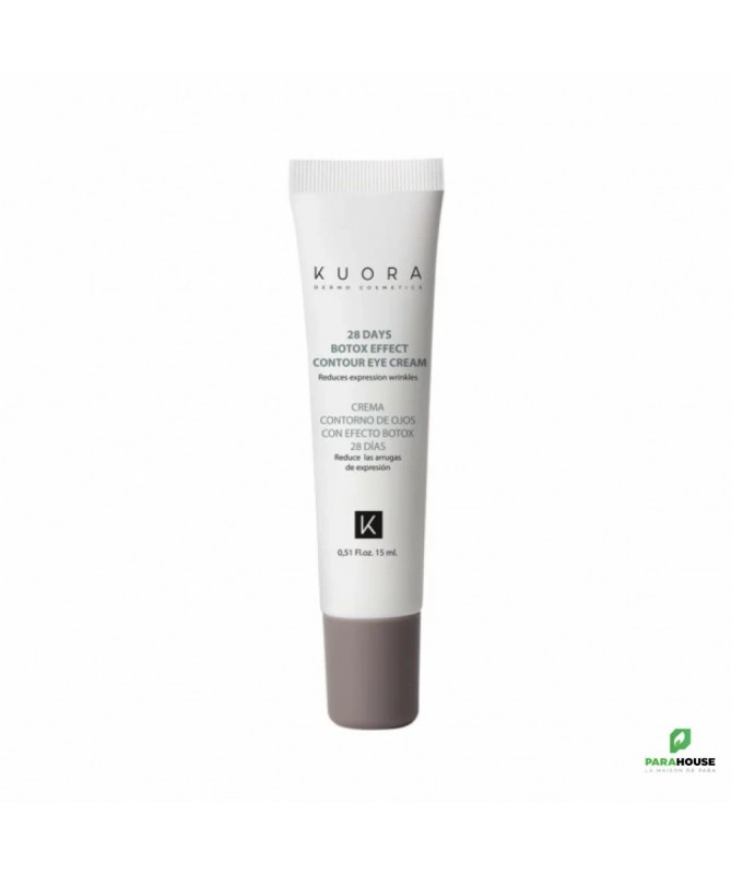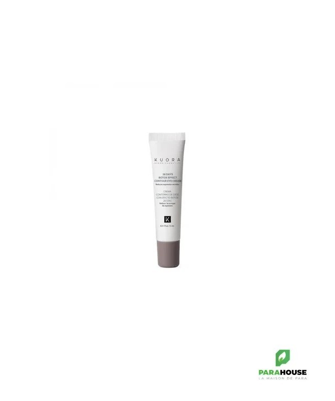 KUORA Contour des Yeux Effet Botox 15ML KUORA Contour des Yeux Effet Botox 15ML avec Syn®-Ake et l'extrait d'hamamélis donne un effet botox naturel en seulement 28 jours. Cette crème est destinée pour tous types de peau et permet de repulper le contour des yeux ce qui réduit l'apparence des pattes d'oie. Cette crème permet d'améliorer l'élasticité naturelle de la peau et de combattre les radicaux libres sur la peau ce qui aide à éliminer les rides et les ridules qui se creusent autour des yeux, les cernes et les signes de fatigue. L'association de peptide synthétique SYN®-AKE 4% avec l'extrait d'hamamélis, la caféine et l'élastine permet de prévenir le relâchement de la peau, nourrir et hydrater la peau, redonner souplesse à l"épiderme, stimuler la production de collagène et favoriser la circulation sanguine. Composition : PEPTIDE SYNTHÉTIQUE (SYN®-AKE) 4% EXTRAIT DE HAMAMELIS CAFÉINE CRL ÉLASTINE VITAMINE E Sans parabens Sans alcool Sans silicones Parfum hypoallergénique Testé dermatologiquement Conseils d'utilisation : Il est conseillé d'utiliser KUORA Contour des Yeux deux fois par jour en exerçant des tapotements doux avec les doigts.