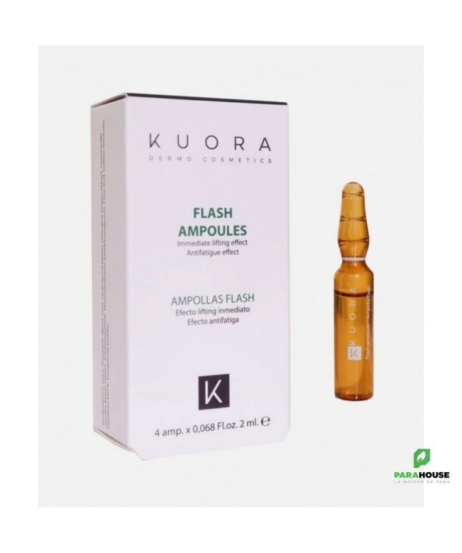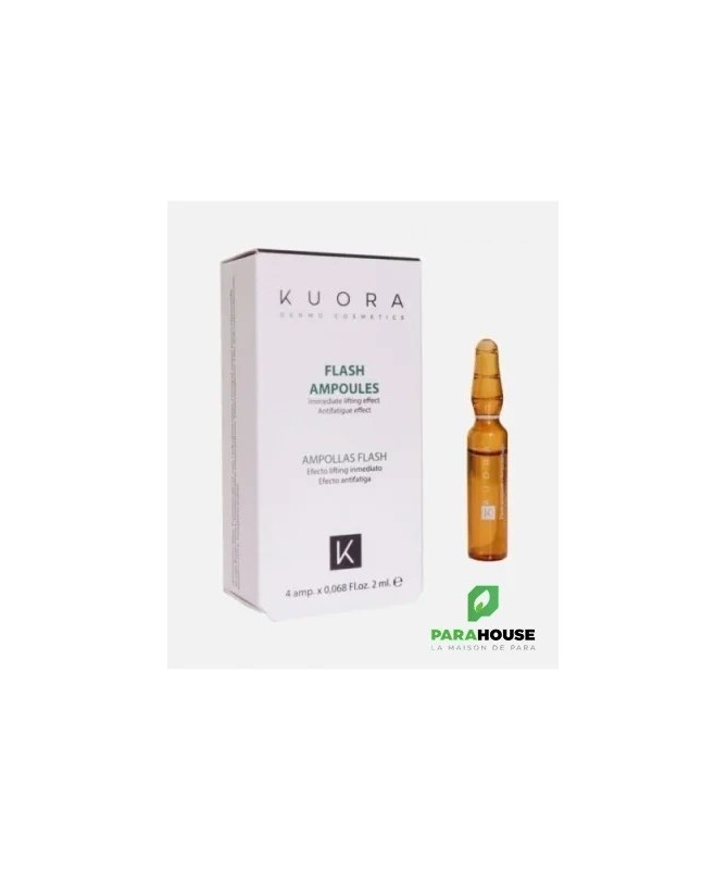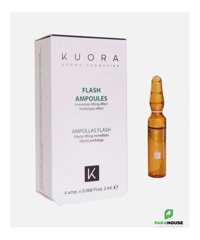 KUORA Flash Ampoule Lifting Immédiat KUORA Flash Ampoule Lifting Immédiat procure un effet raffermissant et liftant instantané, dissimule visuellement les imperfections et excerce une action antifatigue. Elle apporte une profonde hydratation laissant la peau douce et lisse. Grâce à l'incorporation d'extrait de Chondrus Crispus (Mousse d'Irlande) et à ses propriétés antioxydantes et énergisantes, il réduit visiblement les rides superficielles avec un effet lifting immédiat qui, associé à l'élastine, augmente la fermeté et l'élasticité de la peau. C'est le meilleur traitement immédiat pour les peaux fatiguées et dévitalisées. Composition : Extrait de Chondrus Crispus Élastine CLR à 50% Sans parabens Sans alcool Sans silicones Sans parfum Non comédogène Testé dermatologiquement Conseils d'utilisation : Il est conseillé d'appliquér sur le visage, le cou et le décolleté parfaitement nettoyés, en effectuant un léger mouvement circulaire jusqu'à absorption complète.