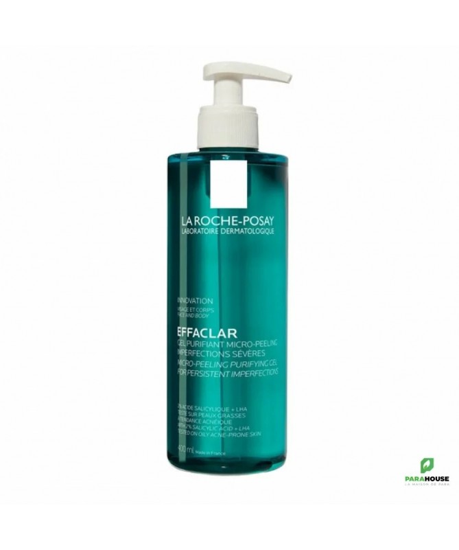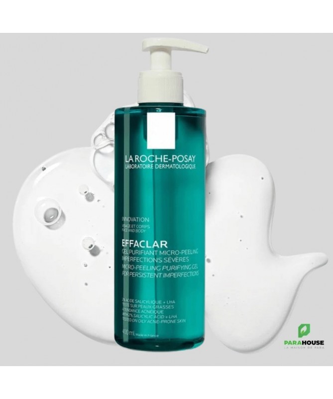 Gel nettoyant visage et corps pour le buste, les épaules et le dos des peaux à tendance acnéique.Grâce à des agents exfoliants sélectionnés qui laissent la texture de la peau plus lisse, le gel micro-peeling EFFACLAR purifie intensément les peaux grasses, désobstrue les pores en profondeur et élimine l'excès de sébum.Il aide à réduire progressivement et durablement les imperfections persistantes, y compris les taches et marques, et à prévenir leur réapparition.1/ EXFOLIE ET LISSE LA PEAUSa formule à partir de LHA permet de micro-exfolier la peau et de ressérer les pores.2/ PURIFIE LES IMPERFECTIONSGrâce à l'Acide Salicylique qu'il contient, ce gel nettoyant anti-imperfections purifie intensément les imperfections du corps. Il désobstrue les pores en profondeur et élimine l'excès de sébum du buste, du dos et des épaules.Évaluation sur des sujets ayant une peau à tendance acnéique* :98% La peau est plus lisse98% Le produit ne laisse pas la peau grasse99% Le parfum du produit est agréableEfficacité anti-récidive prouvée 2 semaines après la fin de l'application du produit sur les imperfections et les marques.Texture :Texture gel moussante.Conseils d’utilisation :Appliquer sur peau humidifiée, masser et rincer. En cas de contact avec les yeux, rincer abondamment.Ingrédients :ACIDE SALICYLIQUE : Désincruste les pores et purifie les imperfections.LHA : Exfolie en douceur et ressère les pores.ZINC : Purifie la peau et réduit le sébum.Liste complète des ingrédients :AQUA / WATER / EAU • SODIUM LAURETH SULFATE • DECYL GLUCOSIDE • GLYCERIN • SODIUM CHLORIDE • COCO-BETAINE • SALICYLIC ACID • PEG-150 PENTAERYTHRITYL TETRASTEARATE • PEG-6 CAPRYLIC/CAPRIC GLYCERIDES • ZINC GLUCONATE • SODIUM HYDROXIDE • CAPRYLOYL SALICYLIC ACID • TETRASODIUM EDTA • CITRIC ACID • MENTHOL • POLYQUATERNIUM-47 • HEXYLENE GLYCOL • SODIUM BENZOATE (F.I.L. B258688/1).