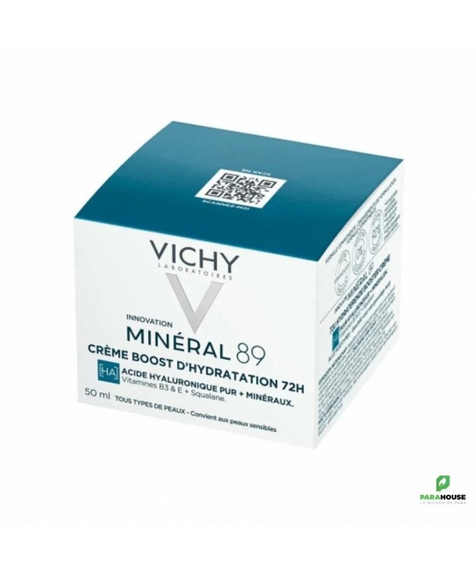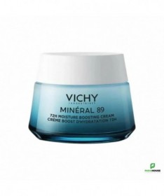 VICHY MINERAL 89 CREME BOOST D’HYDRATATION 72H 50ML VICHY MINERAL 89 CREME BOOST D’HYDRATATION est une crème qui procure jusqu'à 72 heures d'hydratation fortifiante et répare la fonction barrière de tous les types de peaux. Exempte d'ingrédients controversés, la formule de la crème MINÉRAL 89 est enrichie en actifs dermatologiques puissants issus des sciences vertes pour renforcer la barrière cutanée et apporter une hydratation longue durée. Son complexe de 3 actifs agit sur les trois niveaux de l'épiderme : le squalane renforce la fonction barrière et réduit la perte insensible en eau, l'acide hyaluronique pur hydrate et repulpe la peau, et la vitamine B3 ainsi que les minéraux contenus dans l'Eau Volcanique de VICHY boostent la production de céramides et renforcent l’épiderme. Mieux protégée des agressions extérieures, la peau est plus confortable tout au long de la journée : les sensations de tiraillement et les rougeurs sont atténuées. La peau est éclatante, repulpée et revitalisée. Texture crème fraîche fondante et légère, non grasse, non collante et non comédogène. Composition : Aqua/Water/Eau, Glycerin, Dicaprylyl Ether, Pentylene Glycol, Polyglyceryl-6 Distearate, Niacinamide, Propanediol, Cetyl Esters, Jojoba Esters, Cetearyl Isononanoate, Squalane, Behenyl Alcohol, Adenosine, Capryloyl Salicylic Acid, Hydroxyacetophenone, Mineral Salts, Sodium Hyaluronate, Trisodium Ethylenediamine Disuccinate, Vitreoscilla Ferment, Tocopherol, Acacia Decurrens Flower Cera/Acacia Decurrens Flower Wax, Acrylamide/Sodium Acryloyldimethyltaurate Copolymer, Cetyl Alcohol, Helianthus Annuus Seed Cera/Sunflower Seed Wax, Hydroxypropyl Starch Phosphate, Isohexadecane, Polyglycerin-3, Polyglyceryl-3 Beeswax, Polysorbate 80, Sodium Stearoyl Glutamate, Sorbitan Oleate, Parfum/Fragrance. Conseils d'utilisation : Appliquez la Crème Boost d’Hydratation 72H MINERAL 89 matin et soir sur peau propre et sèche en massant délicatement le visage.