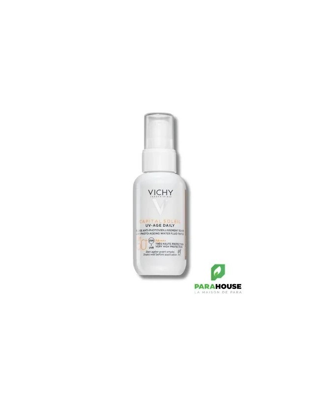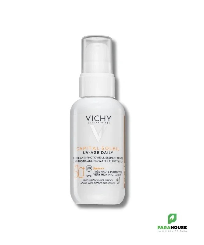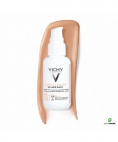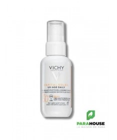 VICHY CAPITAL SOLEIL UV AGE DAILY TEINTE SPF50+ VICHY CAPITAL SOLEIL UV AGE DAILY TEINTE SPF50 est un fluide solaire anti-âge teinté quotidien pour tous types de peaux, qui protège la peau contre les uva et uvb et prévient des photo-dommages. UV Age Daily Teinté SPF50 CAPITAL SOLEIL est un fluide solaire SPF50+ teinté qui offre une protection avancée contre les rayons UVA et UVB grâce à sa technologie multi-brevetée Netlock. Les actifs anti-âge (4 % de peptides et 2 % niacinamide) de VICHY CAPITAL SOLEIL UV AGE DAILY préviennent et corrigent les rides et les taches brunes liées au soleil. Sa formule est cliniquement prouvée sur les signes du photovieillissement, dont les taches pigmentaires, les rides et le manque de fermeté. Conçue pour tous les types de peaux, sa texture fluide ultra légère de UV AGE DAILY agit comme un film protecteur très résistant contre les UV et invisible sur la peau, comme une sensation peau nue. Sa formule teintée, enrichie en pigments minéraux, procure une couvrance légère pour unifier et sublimer le teint. Chaque jour, la peau est protégée des méfaits du soleil et retrouve de la fermeté et de l’éclat, pour un teint unifié et homogène. -27% taches sombres 78% apparence de la peau repulpee 97 % trouvent la couleur agréable. 97 % trouvent l’application facile et uniforme. 88 % trouvent que le produit pénètre vite dans la peau. Composition : AQUA /WATER - ALCOHOL DENAT. - DIISOPROPYL SEBACATE - SILICA - ISOPROPYL MYRISTATE - ETHYLHEXYL SALICYLATE - ETHYLHEXYL TRIAZONE - BIS-ETHYLHEXYLOXYPHENOL METHOXYPHENYL TRIAZINE - BUTYL METHOXYDIBENZOYLMETHANE - GLYCERIN - CI 77891 / TITANIUM DIOXIDE - PROPANEDIOL - C12-22 - ALKYL ACRYLATE/HYDROXYETHYLACRYLATE COPOLYMER - NIACINAMIDE - DROMETRIZOLE TRISILOXANE - PERLITE - TOCOPHEROL - CAPRYLIC/CAPRIC TRIGLYCERIDE - TEREPHTHALYLIDENE DICAMPHOR SULFONIC ACID - CI 77492 / IRON OXIDES - CAPRYLYL GLYCOL - PENTYLENE - GLYCOL - TRIETHANOLAMINE - HYDROLYZED RICE PROTEIN - CI 77491 / IRON OXIDES - TRISODIUM ETHYLENEDIAMINE - DISUCCINATE - SILICA SILYLATE - ACRYLATES / C10-30 - ALKYL ACRYLATE CROSSPOLYMER - BUTYLENE GLYCOL - CI 77499 / IRON OXIDES - HYDROXYETHYLCELLULOSE - VITREOSCILLA FERMENT - DISODIUM EDTA - PARFUM / - FRAGRANCE. Conseils d'utilisation : Versez 5 à 6 pressions de la crème solaire anti-âge UV Age Daily VICHY dans vos mains, puis appliquez sur le visage, le contour des yeux et le cou en effectuant des mouvements liftants. Appliquez le fluide solaire anti-âge visage tous les matins en dernière étape de votre routine beauté. Vichy age daily teinte est idéal pour compléter votre routine quotidienne anti-taches.