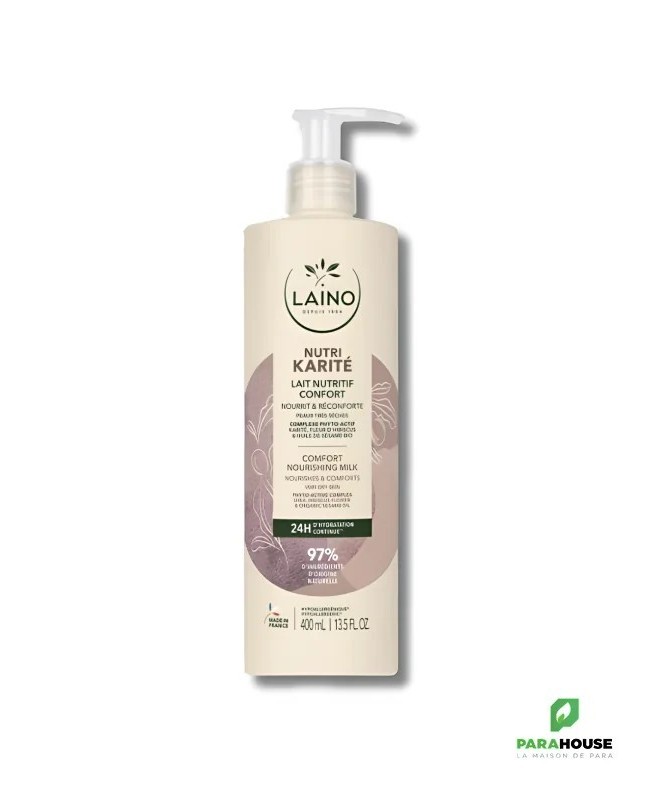 Lait Nutritif Confort LainoLaino a sélectionné le meilleur du bassin méditerranéen pour créer le Lait Nutritif Confort, spécialement conçu pour les peaux très sèches.Riche en beurre de karité, ce soin est l’allié idéal pour lutter contre les tiraillements. L’association glycérine, huile de sésame BIO et extrait de fleur d’hibiscus blanc apaise la peau et assure une hydratation continue pendant 24H*. La peau, délicatement parfumée, est nourrie et protégée.*Formulé pour minimiser les risques d’allergies. Hydratation des couches supérieures de l’épiderme.Conseils d'utilisation :Appliquer matin et soir sur l’ensemble du corps.Composition :AQUA (WATER) / EAUBUTYROSPERMUM PARKII (SHEA) BUTTERISOPROPYLMYRISTATEGLYCERINCETEARYL ALCOHOLGLYCERYL STEARATERICINUS COMMUNIS (CASTOR) SEED OILOLEIC/LINOLEIC/LINOLENIC POLYGLYCERIDESSESAMUM INDICUM (SESAME) SEED OILSODIUM CITRATESQUALANEHIBISCUS SABDARIFFA FLOWER EXTRACTSESAMUM INDICUM (SESAME) SEED EXTRACTPARFUM (FRAGRANCE)PROPANEDIOLCETEARYL GLUCOSIDESODIUM POLYACRYLATEHYDROGENATED CASTOR OILINULIN LAURYL CARBAMATEXANTHAN GUMCOPERNICIA CERIFERA CERA (CARNAUBA WAX)MAGNESIUM ALUMINUM SILICATETETRASODIUM GLUTAMATE DIACETATECAPRYLHYDROXAMIC ACIDCITRIC ACIDCAPRYLYL GLYCOLSODIUM BENZOATEPOTASSIUM SORBATE