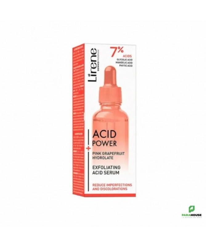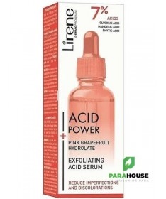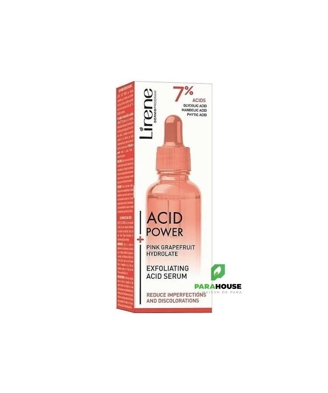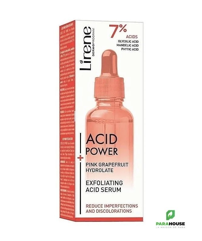 LIRENE ACID POWER SERUM EXFOLIANT 30ML LIRENE ACID POWER SERUM EXFOLIANT contient un complexe d'acides glycolique, mandélique et phytique (7%) qui pénètre dans l'épiderme, stimulant fortement l'exfoliation des cellules kératinisées et la formation de nouvelles. LIRENE ACID POWER SERUM EXFOLIANT permet le renouvellement accéléré de l'épiderme, grâce auquel la peau est progressivement nettoyée, et le nombre de décolorations et de points noirs est réduit. Composition : COMPLEXE D'ACIDES GLYCOLIQUE, MANDÉLIQUE ET PHYTIQUE (7%) ACIDE GLYCOLIQUE : stimule la production de protéines de soutien de la peau, grâce auxquelles les fines rides sont comblées de l'intérieur et les pores deviennent moins visibles ACIDE D'AMANDE : réduit le nombre d'imperfections et la tendance à leur formation ACIDE PHYTIQUE : inhibe l'activité de la tyrosinase (une enzyme responsable de la formation de la mélanine), réduisant la décoloration et unifiant le teint de la peau HYDROLAT DE PAMPLEMOUSSE réduit la tendance au gras, nettoie et désobstrue les pores Aqua (Water), Glycerin, Propanediol, Glycolic Acid, Mandelic Acid, Sodium Hydroxide, Citrus Grandis (Grapefruit) Fruit Extract, Inulin, Fructose, Glucose, Phytic acid, Cellulose Gum, Sodium Phytate, Xanthan Gum, Cellulose, Calcium Gluconate, Gluconolactone, Sodium Benzoate, Potassium Sorbate Conseils d'utilsiation : Masser LIRENE ACID POWER SERUM le soir sur la peau du visage nettoyée et soigneusement séchée en évitant le contour des yeux et de la bouche. Appliquez votre crème Lirene préférée. Pendant l'utilisation et une semaine après utilisation, il est recommandé de protéger la peau avec un filtre UV élevé contre l'exposition au soleil. Immédiatement après l'application, il peut y avoir une légère sensation de brûlure, qui est une réaction naturelle de la peau à l'action des acides.