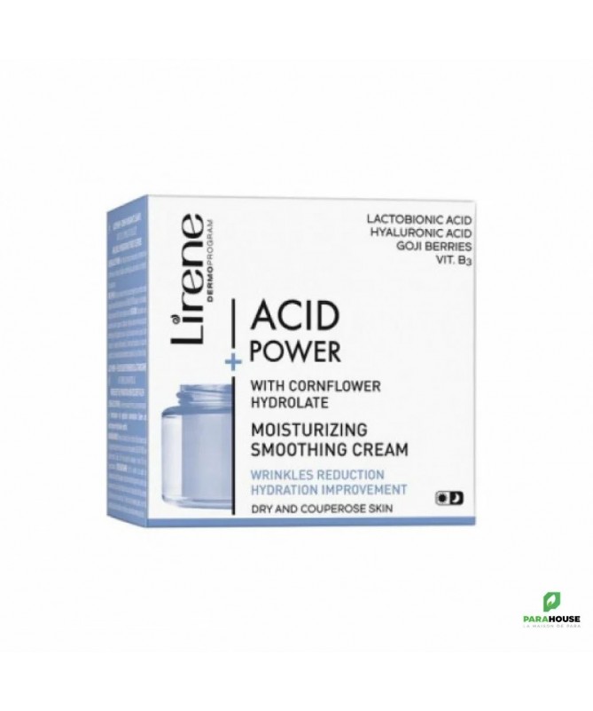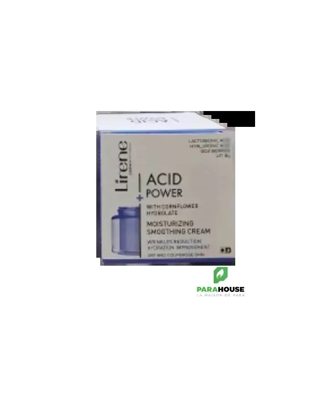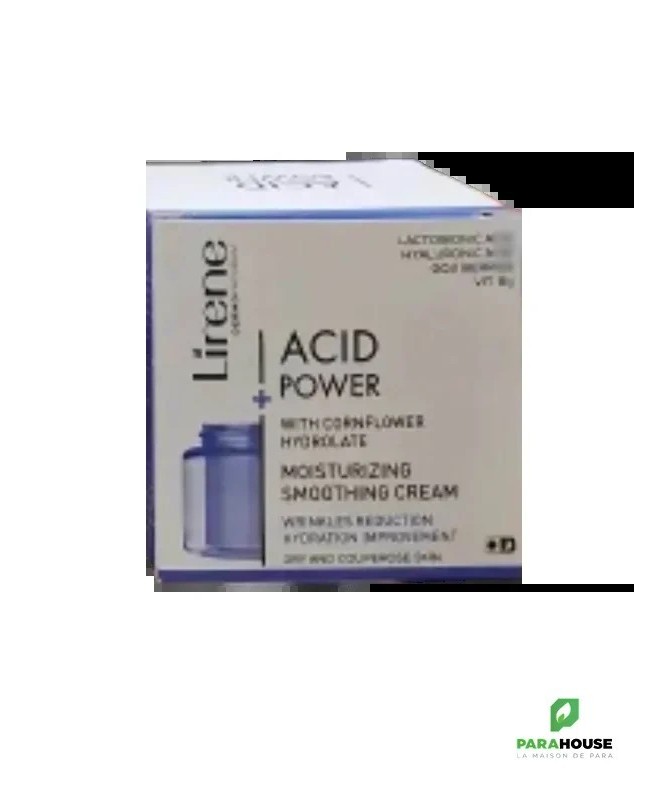 LIRENE ACID POWER CREME LISSANTE HYDRATANTE 50ML LIRENE ACID POWER CREME LISSANTE HYDRATANTE améliore l'hydratation et l'élasticité; en même temps, elle réduit la visibilité des rougeurs et restaure un teint sain. Composition : ACIDE LACTOBIONIQUE HYDROLAT DE BLEUET : apaise les irritations et les rougeurs ; haute teneur en antioxydants protège contre les effets néfastes des radicaux libres responsables du vieillissement cutané ACIDE HYALURONIQUE DE HAUT MOLÉCULAIRE : minimise la perte d'eau de l'épiderme, lisse et apaise la peau VITAMINE B₃ : soutient la régénération de l'épiderme, régule la production de céramides nécessaires au maintien de la santé et de la jeunesse de la peau : BAIES DE GOJI DE L'HIMALAYA : appelées "baies heureuses", contiennent des nutriments aux propriétés antioxydantes, énergisantes et lissantes pour la peau HUILE DE CHANVRE ET BEURRE DE KARITE : donner à la peau douceur et élasticité VITAMINE E : a un effet rajeunissant et protecteur Aqua (Water), Propanediol, Glyceryl Stearate, Butyrospermum Parkii (Shea) Butter, C13-15 Alkane, Cetearyl Alcohol, Dimethicone, Cetyl Alcohol, Lactobionic Acid, C15-19 Alkane, Glycerin, Niacinamide, Centaurea Cyanus Flower Water, Sodium Hyaluronate, Cannabis Sativa (Hemp) Seed Oil, C13-14 Isoparaffin, Helianthus Annuus (Sunflower) Seed Oil, Salvia Hispanica Seed Extract, PEG-75 Stearate, Hydroxyacetophenone, Polyacrylamide, Ceteth-20, Steareth-20, Xanthan Gum, Tocopherol, Laureth-7, Sodium Phytate, Lycium Barbarum Fruit Extract, Citric Acid, Sodium Benzoate, Potassium Sorbate, Parfum (Fragrance) Conseils d'utilisation : Matin et soir, masser LIRENE ACID POWER CREME sur la peau du visage et du cou en évitant le contour des yeux. Pendant l'utilisation, protéger la peau avec un filtre UV contre l'exposition au soleil. Immédiatement après l'application, il peut y avoir une légère sensation de brûlure, qui est une réaction naturelle de la peau à l'action des acides.