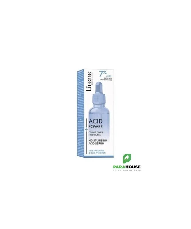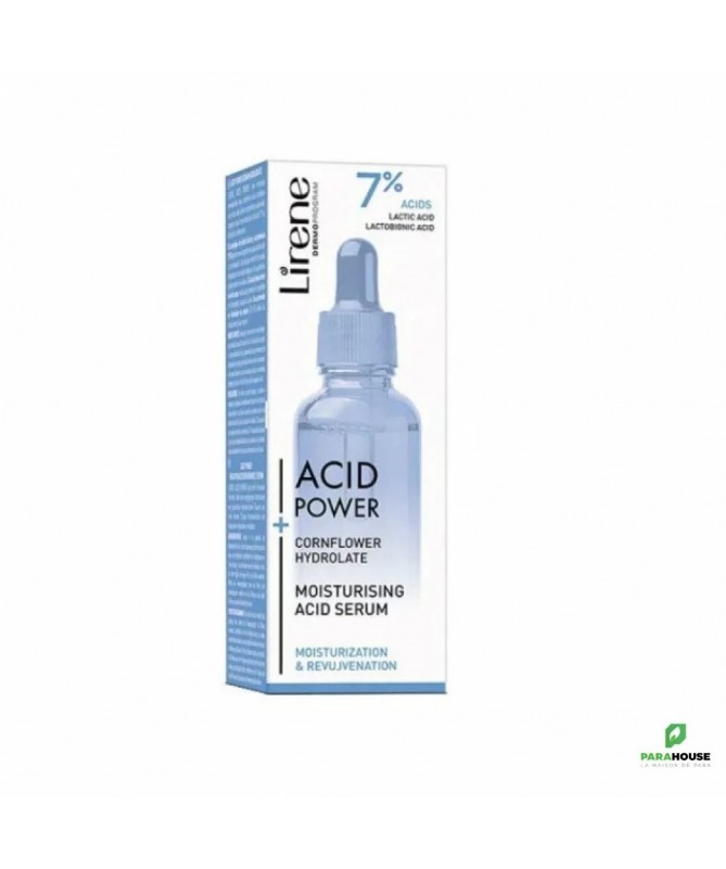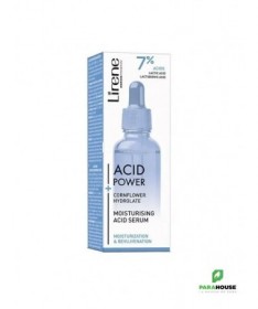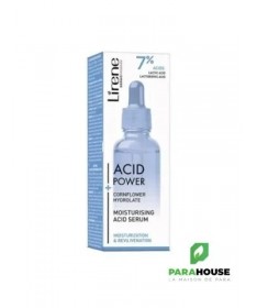 LIRENE ACID POWER SERUM HYDRATANT 30ML LIRENE ACID POWER SERUM HYDRATANT est conçu pour le soin des peaux sèches et couperosées.Sa composition comprend un complexe d'acides qui stimulent les processus de renouvellement de la peau, grâce auxquels elle se régénère plus rapidement et retrouve son élasticité et son aspect jeune. Composition : COMPLEXE D'ACIDES LACTIQUE ET LACTOBIONIQUE (7%) : pénètre l'épiderme, stimulant son renouvellement; grâce à cela, les cellules nouvellement formées déplacent les cellules plus anciennes (kératinisées) vers la surface, où elles sont exfoliées, en conséquence, la peau se régénère, retrouve son élasticité et son éclat, et les rides et ridules deviennent visiblement moins profondes ACIDE LACTIQUE : grâce à sa capacité à lier l'eau, il augmente le niveau d'hydratation pendant longtemps ACIDE LACTOBIONIQUE : réduit la visibilité des rougeurs et des télangiectasies ACIDE HYALURONIQUE DE HAUT MOLÉCULAIRE : prévient la déshydratation et lisse la peau 20% HYDROLAT DE BLEUET : apaise les irritations et les rougeurs, et la haute teneur en antioxydants protège des radicaux libres responsables du vieillissement cutané extrinsèque Aqua (Water), Centaurea Cyanus Flower Water, Glycerin, Propanediol, Lactic Acid, Lactobionic Acid, Sodium Hydroxide, Inulin, Sodium Hyaluronate, Fructose, Glucose, Cellulose Gum, Sodium Phytate, Xanthan Gum, Cellulose, Calcium Gluconate, Gluconolactone, Sodium Benzoate Conseils d'utilisation : Masser LIRENE ACID POWER SERUM le soir sur la peau du visage nettoyée et soigneusement séchée en évitant le contour des yeux et de la bouche. Appliquez votre crème Lirene préférée. Pendant l'utilisation et une semaine après utilisation, il est recommandé de protéger la peau avec un filtre UV élevé contre l'exposition au soleil. Immédiatement après l'application, il peut y avoir une légère sensation de brûlure, qui est une réaction naturelle de la peau à l'action des acides.