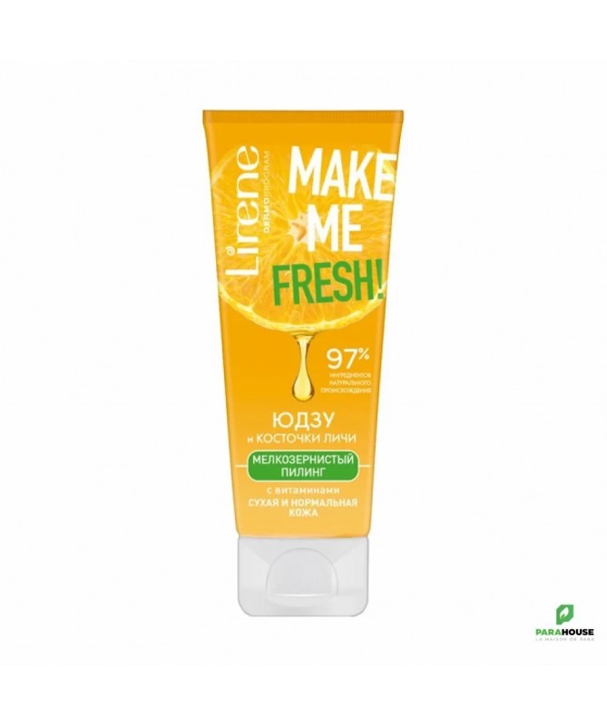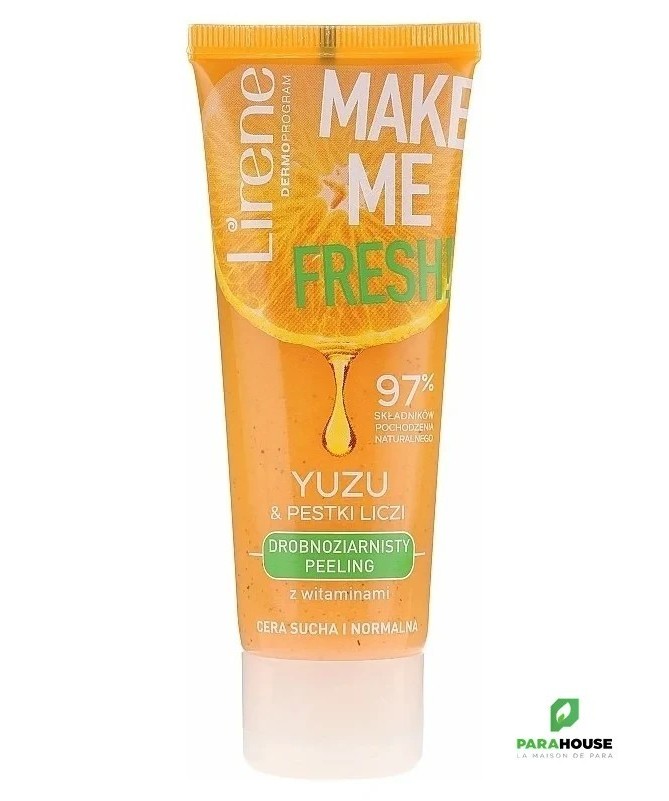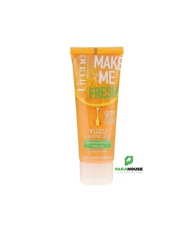 LIRENE MAKE ME FRESH PEELING 75ML LIRENE MAKE ME FRESH PEELING exfolie idéalement les épidermes morts, élimine les imperfections et lisse instantanément la peau. Les ingredients purifient et rafraîchissent la peau, procurant une hydratation longue durée. Recommandé pour tous les types de peaux, particulièrement sèches et normales. Composition : Aqua (water), synthetic wax, cocamidopropyl betaine, glycerin, polyglyceryl-4 caprate, coco-glucoside, acrylates/C10-30 alkyl acrylate crosspolymer, methyl gluceth-20, hydroxyacetophenone, sodium hydroxide, litchi chinensis seed powder, butylene glycol , sodium hyaluronate, citrus junos fruit extract, ascorbyl palmitate, helianthus annuus (sunflower) seed oil, tocopherol, sodium benzoate, potassium sorbate, parfum (fragrance), capsanthin/capsorubin. Conseils d'utilisation : AppliquerLIRENE MAKE ME FRESH PEELING sur le visage en évitant le contour des yeux. Masser en mouvements circulaires pendant 2-3 minutes. Rincer abondamment à l'eau tiède. Utilisez ensuite votre tonique et votre crème Lirene préférés. LIRENE MAKE ME FRESH PEELING doit être appliqué 2 fois par semaine.
