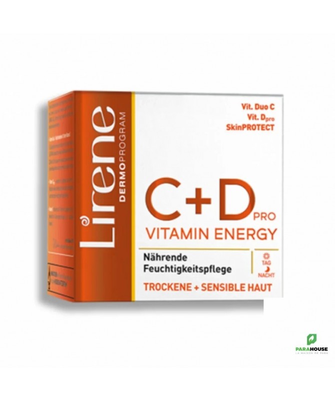 LIRENE C+D Creme Hydratante en Profondeur - Peaux Sèches et Sensibles LIRENE C+D Creme Hydratante en Profondeur est un soin de jour et de nuit, basé sur le complexe de vitamine Duo C associé à la vitamine Dpro qui aide à préserver et protéger la jeunesse de la peau. LIRENE C+D Creme procure un éclat perceptible grâce à la vitamine Duo C avec son effet revitalisant et éclaircissant, combinée à la vitamine Dpro qui renforce la barrière protectrice de l'épiderme et renforce la régénération cellulaire ; résultat : une peau éclatante, ferme et jeune. Le complexe SkinPROTECT utilisé dans ce soin, crée un film protecteur sur la peau qui l'aide pour résister mieux au dessèchement et assure avec la vitamine E la protection contre les radicaux libres ; résultat : une peau saine, nourrie et mieux protégée contre les facteurs extérieurs. Conseils d'utilisation : Il est conseillé d'utiliser LIRENE C+D Creme tous les jours. Il est indiqué que cette crème peut être utilisée comme base de maquillage. Composition : 230330 Składniki/Ingredients: Aqua (Water), Isononyl Isononanoate, Cetyl Alcohol, Glycerin, Caprylic/Capric Triglyceride, Glyceryl Stearate, Dimethicone, Hydrogenated Olive Oil Decyl Esters, Lactose, Mannitol, Ascorbyl Tetraisopalmitate, Sodium Hyaluronate, Cichorium Intybus (Chicory) Root Extract, 3-O-Ethyl Ascorbic Acid, Lecithin, Lonicera Caprifolium Flower Extract, Lonicera Japonica Flower Extract, Hydroxyacetophenone, Tocopheryl Acetate, C13-14 Isoparaffin, PEG-75 Stearate, Polyacrylamide, Ceteth-20, Steareth-20, Microcrystalline Cellulose, Ethylhexylglycerin, Laureth-7, Aluminum Hydroxide, Polysorbate 20, Hydroxypropyl Methylcellulose, Phenoxyethanol, Dehydroacetic Acid, Benzoic Acid, Parfum (Fragrance), Limonene, Hexyl Cinnamal, Citronellol, Linalool, Geraniol, Benzyl Alcohol, CI 77492 (Iron Oxides), CI 12085 (D&C Red No. 36), CI 19140 (FD&C Yellow No. 5), CI 16035 (FD&C Red No. 40)