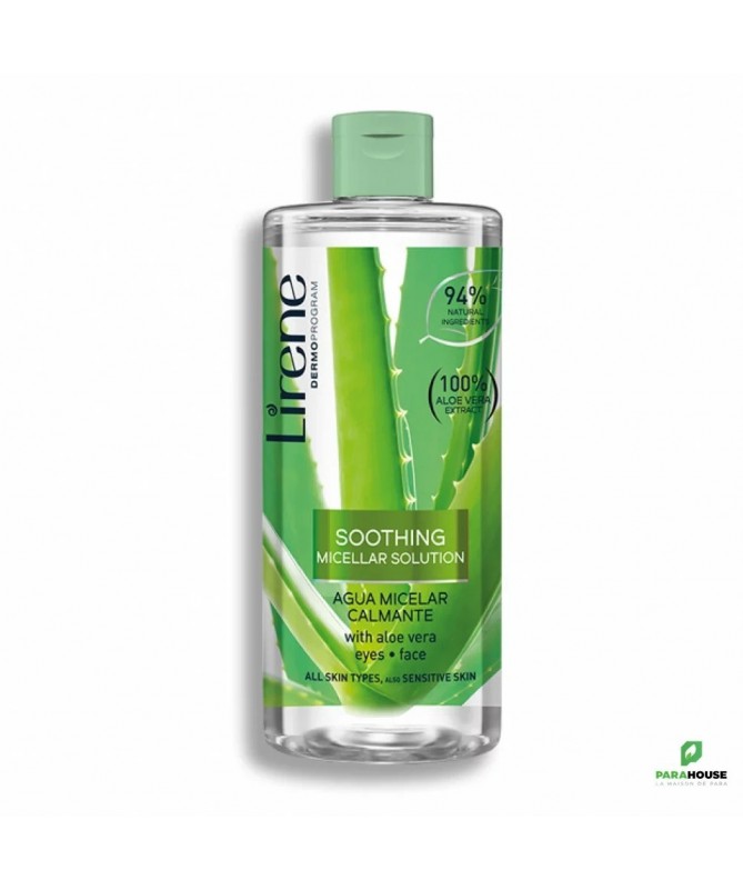 LIRENE Eau Micellaire Apaisante à l'Aloe Vera 400ML LIRENE Eau Micellaire Apaisante à l'Aloe Vera possède une formule naturelle d'aloe vera. Basée sur la synergie d'ingrédients nettoyants et apaisants, elle : élimine efficacement le maquillage et les impuretés de la peau du visage et du contour des yeux. booste la régénération des cellules. hydrate en profondeur rafraîchit LIRENE Eau Micellaire Apaisante assure un nettoyage en profondeur du visage et du contour des yeux du maquillage et des impuretés. L'extrait d'aloès 100% naturel apaise efficacement les irritations et apaise la peau. Grâce à ses propriétés uniques, il hydrate et redonne douceur à la peau, la laissant rafraîchie, lisse et régénérée pendant longtemps. Grâce à sa formule délicate, il est également recommandé pour les peaux sensibles Résultats 93% Nettoyage 93% R afraîchissement de la peau 80% R estaurer le confort Composition : 220913 Składniki/Ingredients: Aqua (Water), Aloe Barbadensis Leaf Juice, Glycerin, Poloxamer 188, Pentylene Glycol, Propanediol, Sodium Acetylated Hyaluronate, Sodium Hyaluronate, Sodium Hyaluronate Crosspolymer, Hydrolyzed Sodium Hyaluronate, Hydroxyacetophenone, Decyl Glucoside, Sodium Phytate, Ethylhexylglycerin, Potassium Sorbate, Sodium Benzoate, Parfum (Fragrance) Conseils d'utilisation : Mettez LIRENE Eau Micellaire sur le coton. Étalez-la en nettoyant la peau du visage et la peau autour des yeux. Répétez jusqu'à ce que l'écouvillon soit propre. Après utilisation, nous conseillons d'appliquer la crème Lirene adaptée à la peau.