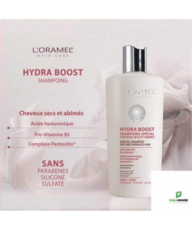 L'ORAMEL HYDRA BOOST Shampoing Cheveux Secs Et Abimes 300ML L'ORAMEL HYDRA BOOST Shampoing est un soin lavant réparateur HYDRABOOST enrichi en acide hyaluronique, pro-vitamine B5 et complexe Pentavitin. Ses actifs naturels aux vertus régénérantes, nutritives et hydratantes nourrissent votre chevelure en profondeur pour vous garantir des cheveux réparés, souples et brillants Sans Parabène, Sans Silicone, Sans Sulfate