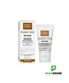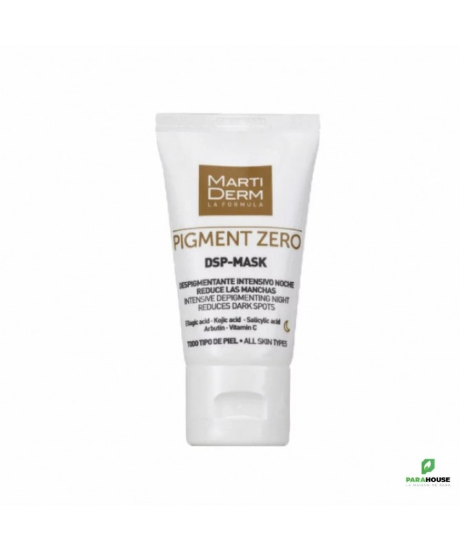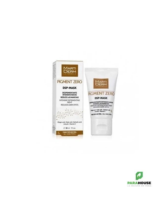 MARTIDERM DSP-Mask 30ML DSP Mask de MARTIDERM est un masque au kaolin dépigmentant intensif pour une utilisation de nuit. Sa forte teneur en actifs en fait le soin le plus intensif de la gamme. Dont les Actifs sont : Acide kojique : Réduit la production de mélanine. Antioxydant. Acide salicylique : Unifie le teint de la peau. MARTIDERM PIGMENT ZERO DSP Mask permet un ef fet dépigmentant en réduisant le t aux de mélanine pour une peau plus douce et plus lisse Conseils d'utilisation : Il est recommendé d'appliquer le mask dsp Matiderm le soir sur les zones hyperpigmentées à traiter, de Laisser agir pendant 30 minutes, d'Augmenter progressivement la durée par périodes de 30 minutes, Il est possible de laisser toute la nuit suivant la tolérance de la peau selon les besoins et finalement Rincer abondamment à l'eau.