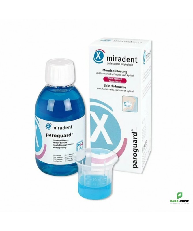 MIRADENT Paroguard Bain de Bouche 200ML MIRADENT Paroguard Bain de Bouche possède les proprietes suivantes : A utiliser avant les traitements prophylactiques Reminéralisant grâce au fluorure (250 ppm) Astringent dû à l'hamamélis Anti-cariogène grâce au xylitol Sans alcool MIRADENT Paroguard est utilisé pour les soins de longue durée et le nettoyage avec une capacité d'hygiène buccale. La solution pour bain de bouche est sans alcool, prend soin des gencives en douceur et prévient les irritations des gencives, de la bouche et de la gorge. Les ingrédients essentiels de MIRADENT Paroguard ont les fonctions suivantes : Le fluor reminéralise, augmente la résistance à la carie dentaire et développe un effet synergique avec la chlorhexidine. Le xylitol est acariogène, prévient la carie dentaire et a un pH neutre. L'hamamélis protège des irritations des gencives (effet légèrement astringent). La combinaison d'ingrédients conduit à une réduction significative des composés méthyliques contenant du soufre (revêtement de la langue) sur le dos de la langue. De cette façon, une réduction durable de la mauvaise haleine peut être obtenue. Le bouchon doseur vous permet d'appliquer la quantité optimale de solution de rinçage buccal Composition : Aqua, Xylitol, Glycerin, PEG-40 Hydrogenated Castor Oil, Panthenol, Aroma, Chamomilla Recutita Flower Water, Hamamelis Virginiana Leaf Water, Chlo rhexidine Digluconate, Sodium Citrate, Allantoin, Sodium Fluoride, Citric Acid, Lactic Acid, Sodium Chloride, Sodium Sulfate, Sodium Benzoate, Potassium Sorbate, Limonene, CI 42090