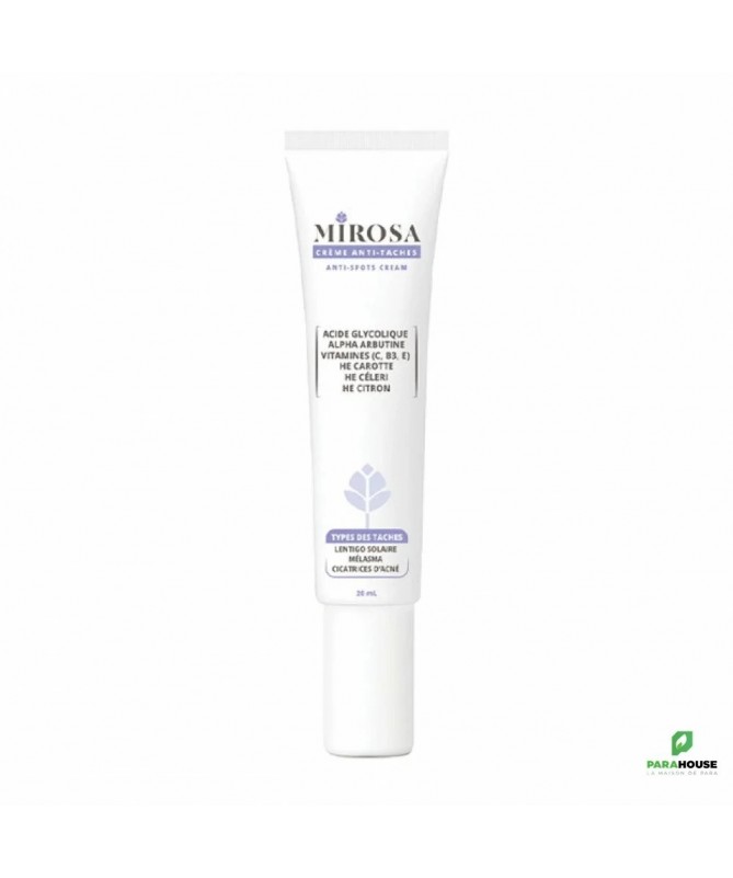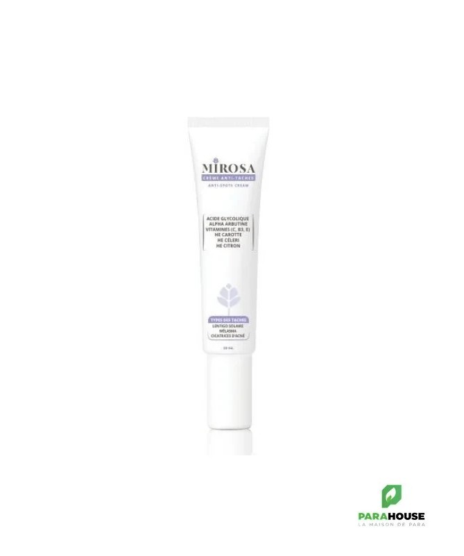 MIROSA CREME ANTI TACHES 20ML MIROSA CREME ANTI TACHES est Conseillée pour lutter contre les taches brunes liées au vieillissement cutané ou à la grossesse. Grâce à sa formule riche en huiles essentielles, actifs et vitamines, elle permet de : Unifier le teint et rendre la peau du visage fraîche et lumineuse.Atténuer les taches et les irrégularités pigmentaires.Diminuer considérablement les taches et réduir leur coloration. Composition : AQUA (purified water), ROSA CANINA SEED OIL, SIMMONDSIA CHINENSIS SEED OIL, DAUCUS CAROTA SATIVA SEED OIL, APIUM GRAVEOLENS SEED OIL, CITRUS LIMON PEEL OIL, ALPHA-ARBUTIN, GLYCOLIC ACID, ASCORBYL GLUCOSIDE (vitamine c), NIACINAMIDE, GLYCERYL STEARATE, XANTHAN GUM, TOCOPHEROL, sodium benzoate, potassium sorbate. Conseils d'utilisation : Appliquer MIROSA CREME ANTI TACHES chaque nuit sur un visage préalablement nettoyé avec le gel nettoyant MIROSA. Masser légèrement jusqu’à pénétration complète. Ne convient pas aux femmes enceintes et allaitantes. Eviter l’exposition au soleil. Usage externe.
