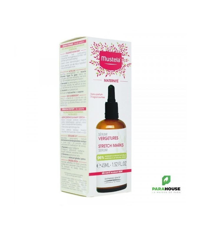 Mustela Serum Correction Vergetures 45ML Mustela Serum Correction Vergetures est spécifiquement formulé pour les futures et jeunes les mamans. Ce Serum correction cible les vergetures tout en favorisant leur réduction grâce à une formule spécifique riche en actifs et ingrédients d’origine naturelle. Formulé à partir d'huile de maracuja, reconnue pour ses propriétés hydratantes, serum vergeture mustela favorise la réduction des vergetures, en renforçant et en assouplissant la peau. L'ingrédient phare de la gamme maternité, le concentrat d'huile de maracuja (fruit de la passion), un actif naturel breveté, a été spécifiquement choisi pour pour améliorer l’élasticité et préserver la souplesse de la peau des futures mamans. Il est issu de filières d'approvisionnement durables et responsables. Les peptides d’avocat, actifs brevetés anti-tiraillements visent à apporter de l'élasticité, de la souplesse et du confort à votre peau. L’Elastoregulateur qui se présente comme un puissant actif d'origine naturelle,et qui se caractérise par une action régénératrice des fibres de collagène et d’élastine altérées lors de la formation des vergetures. Les oligo-éléments aux propriétés réparatrices qui favorisent la régénération cutanée tout en réduire les vergetures déja constituées. CONSEILS D'UTILISATION : Il est recommandé de suivre les étapes suivantes : Appuyer sur la pipette et recueillir quelques gouttes du serum vergeture mustela dans les mains. Appliquer sur les vergetures (mais pas sur la cicatrice de césarienne). Répéter l'opération matin et soir pendant 8 semaines. Composition: AQUA/WATER/EAU, GLYCERIN, PERSEA GRATISSIMA (AVOCADO) OIL, POLYACRYLATE CROSSPOLYMER-6, 1,2-HEXANEDIOL, PASSIFLORA EDULIS SEED OIL, TOCOPHEROL, CAPRYLYL GLYCOL, HYDROLYZED HYALURONIC ACID, TRISODIUM ETHYLENEDIAMINE DISUCCINATE, CITRIC ACID.