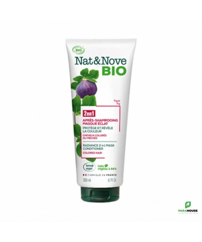 NAT&NOVE BIO 2en1 Apres Shampoing Masque Eclat 200ML NAT&NOVE BIO 2en1 Apres Shampoing Masque eclat est le secret pour profiter plus longtemps de votre coloration. Préservez-la avec un soin capillaire ciblé qui vous garantit des cheveux resplendissants de beauté. Quelques minutes suffisent pour protéger vos cheveux colorés avec notre après-shampooing Éclat certifié bio. En soin express comme en masque à laisser poser, il vous offre la même efficacité pour raviver l’éclat de votre chevelure Composition : AQUA/WATER/EAU, CETEARYL ALCOHOL, COCO-CAPRYLATE/CAPRATE, ALOE BARBADENSIS LEAF POWDER*, PARFUM (FRAGRANCE), PALMITIC ACID, STEARIC ACID, SODIUM STEAROYL GLUTAMATE, COCODIMONIUM HYDROXYPROPYL HYDROLYZED WHEAT PROTEIN, SODIUM BENZOATE, POTASSIUM SORBATE, CITRIC ACID, XANTHAN GUM, GLYCERIN**, FICUS CARICA (FIG) FRUIT EXTRACT*. *Ingrédients issus de l'Agriculture Biologique. **Transformés à partir d'ingrédients Biologiques. 99% du total est d'origine naturelle. 14% du total des ingrédients sont issus de l'Agriculture Biologique. Conseils d'utilisation : Il est conseillé d'appliquer après NAT&NOVE BIO 2en1 Apres Shampoing Masque eclat sur les longueurs et les pointes essorées. Laisser poser 1 à 2 minutes pour un usage après-shampoing et prolonger jusqu'à 5 minutes pour un usage masque. Démêler puis rincer.