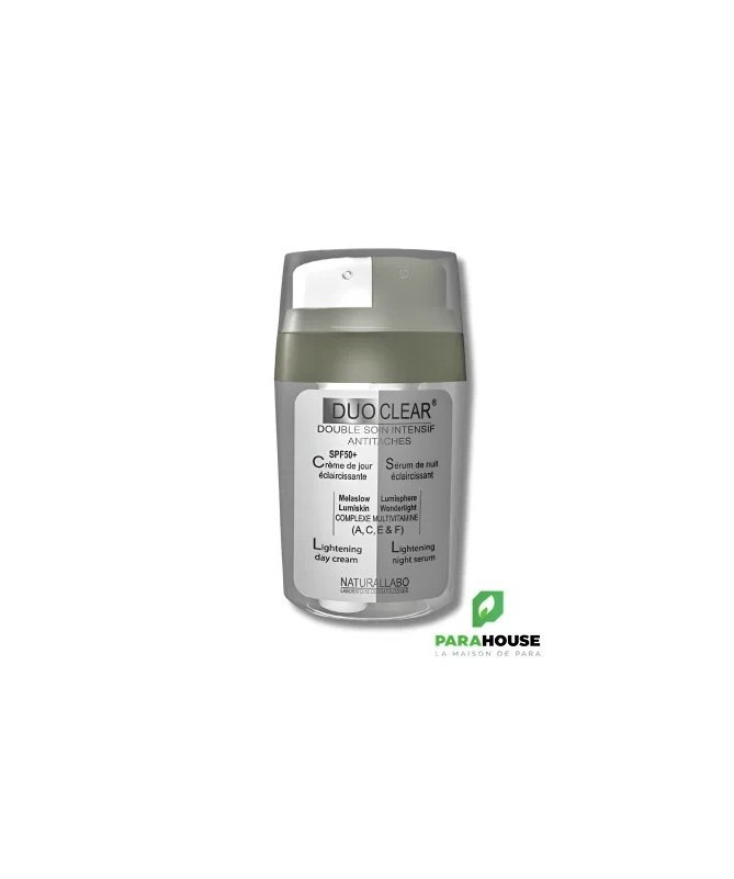 Duo Clear - Double Soin Intensif Anti-Taches BrunesPour réduire l’apparence des taches brunes et prévenir leur réapparition, il est recommandé d’utiliser uncrème et sérum éclaircissantsqui agissent sur la synthèse de mélanine.LeDuo Clearcombine des extraits de plantes et des actifs éclaircissants puissants pour tous types de taches brunes et traces post-inflammatoires. Sa formule enrichie en vitamines A, C, E et F revitalise et apporte santé et éclat à la peau.2 en 1 : Crème de jour & Sérum de nuitDuo Clear associe :Crème de jour anti-taches :protège contre les UVA/UVB avec MelaSlow + Lumiskin, agit sur le manque d’éclat et l’apparition des taches pigmentaires, avec SPF50+ pour prévenir la pigmentation.Sérum de nuit :Lumisphère + WonderLight, exfolie en douceur, lisse les irrégularités, affine le grain de peau et réduit visiblement les taches.Complexe multivitaminéVitamines A, C, E et F pour reconstituer la barrière lipidique, régénérer la peau et restaurer son éclat jour et nuit.Instructions d’utilisationSoin de jour :Appliquer une dose de crème sur les taches visibles ou sur toutes les zones à traiter en cas de pigmentation faciale.Soin de nuit :Sur peau propre et sèche, appliquer une dose de sérum sur les taches ou hyperpigmentations. Ajouter une seconde dose si nécessaire.Un flacon luxueux, facile à transporter, qui combine deux soins en un pour un teint plus uniforme, lumineux et éclatant.