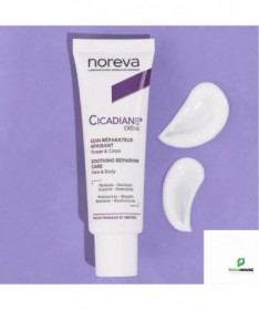 NOREVA CICADIANE CREME 40ML NOREVA CICADIANE CREME REPARATRICE a été mise au point par des dermatologues experts afin d’assurer protection, hydratation, restauration rapide et optimale de la barrière cutanée suite à des altérations épidermiques diversses : peau lésée, irritée, sensible, post actes esthétiques, post interventions, etc. Sa formule à la texture légère et non parfumée, pénètre rapidement pour un confort immédiat. Elle peut s’appliquer sur le visage, le corps et les zones péri-muqueuses dès la naissance, chez l’enfant et l’adulte. 96% peau rapidement régénérée 82% peau réparée et durablement nourrie 100% application facile et non douloureuse 96% calme rapidement les sensations d'inconfort Les + de NOREVA CICADIANE CREME : Pénètre rapidement Application sans douleur Brevet Ion argent/Acide hyaluronique Remodelage optimal de la cicatrice Protège la peau en limitant la prolifération bactérienne Formule bébé, enfant, adulte Composition: Acide Hyaluronique BPM : favorise le processus de réparation cutanée et apaise les sensations de douleur. Agents hydratants et filmogènes : protègent, hydratent et assurent un remodelage cicatriciel esthétique Dermaseptine AG+ : limite la prolifération bactérienne y compris regroupée en biofilm. AQUA (WATER), DIBUTYL ADIPATE, DIETHYLAMINO HYDROXYBENZOYL HEXYL BENZOATE, BIS-ETHYLHEXYLOXYPHENOL METHOXYPHENYL TRIAZINE, DIISOPROPYL SEBACATE, GLYCERIN, ETHYLHEXYL TRIAZONE, ACRYLATES/C12-22 ALKYL METHACRYLATE COPOLYMER, PENTAERYTHRITYL DISTEARATE, CETEARYL ALCOHOL, DISODIUM CETEARYL SULFOSUCCINATE, ARGININE, HYDROLYZED HYALURONIC ACID, MAGNESIUM ASPARTATE, ZINC GLUCONATE, COPPER GLUCONATE, XANTHAN GUM, SODIUM BENZOATE, COCO-GLUCOSIDE, CHLORPHENESIN, POTASSIUM SORBATE, DISODIUM EDTA, CITRIC ACID, DISODIUM LAURYL SULFOSUCCINATE, PENTYLENE GLYCOL, SODIUM SULFATE. Conseils d'utilisation: Il est indiqué: d'appliquer cicadiane crème réparatrice 1 fois par jour sur une peau propre et sèche => Chez les enfants de moins de 3 ans, d'appliquer Cicadiane 1 à 2 fois par jour sur une peau propre et sèche => Adultes et enfants de plus de 3 ans,
