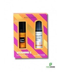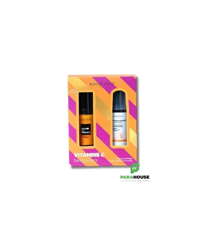 Routine 100% Vitamine CDéveloppée par les Docteurs Novexpert, cette routine est idéale pour les peaux manquant d’éclat, au teint terne ou présentant des rides et ridules. Antioxydante, anti-teint terne et anti-âge, la Vitamine C est l’actif incontournable pour un teint éclatant lors du réveillon.Un coffret pour une triple action prouvée cliniquement :Nettoie efficacement :La Mousse Nettoyante Flash Éclat nettoie la peau en douceur grâce à une texture onctueuse et enveloppante. Enrichie en Vitamine C, extraits de papaye et gluconolactone, elle offre un coup d’éclat dès la première étape de votre routine.Donne de l’éclat :Le Sérum Booster à la Vitamine C, contenant 25% de Vitamine C stabilisée, procure un coup d’éclat immédiat et durable grâce à l’action antioxydante de la Vitamine C.Lisse immédiatement :La Mousse Nettoyante Flash Éclat offre un effet peeling, tandis que le Sérum Booster à la Vitamine C agit également comme un booster de collagène et antioxydant pour un effet lissant visible.Ce duo vitaminé est également plébiscité par les hommes !