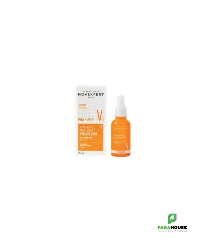 NOVEXPERT SOIN PEELING ECLAT VITAMINE C 30ML NOVEXPERT SOIN PEELING ECLAT VITAMINE C ; Une peau plus douce juste après l'application, un teint lumineux en 24h une peau lissée en 28 jours*, ce sont les promesses tenues par le Soin Peeling Eclat. Conséquences logiques d'une formulation réalisée par des scientifiques avec : De la vitamine C ultra-stable capable de neutraliser 93% des acteurs de l'oxydation. Des actifs peeling sélectionnés pour agir efficacement sans irriter : 96% des utilisateurs trouvent leur teint plus éclatant après une seule utilisation RESULTATS : 96% TEINT PLUS ECLATANT : des volontaires trouvent leur peau plus éclatant immédiatement après l'application. 96% PEAU PLUS LISSE : des volontaires trouvent leur peau plus lisse après 48h. 88% RIDULES DIMINUEES : des volontaires trouvent leurs ridules atténuées après 28 jours. Composition : Formule INCI : Aqua (Water)°, Lactic Acid°, Propanediol°, Sodium Citrate°, Glycerin°, 3-O-Ethyl Ascorbic Acid°, Lactobacillus Ferment°, Galactoarabinan°, Gluconolactone°, Sodium Hyaluronate°, Bacillus Ferment°, Laminaria Digitata Extract°, Helichrysum Italicum Extract°, Aloe Barbadensis Leaf Juice Powder°, Citric Acid°, Parfum (Fragrance)°, Xanthan Gum° Conseils d'utilisation : Uniquement le soir. Attendez 5 min après le nettoyage. Appliquez avec les doigts ou une lingette en coton sur l'ensemble du visage, en évitant le contour des yeux. Le Sérum Peeling Eclat ne se rince pas.