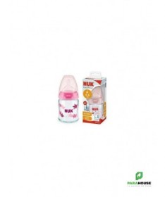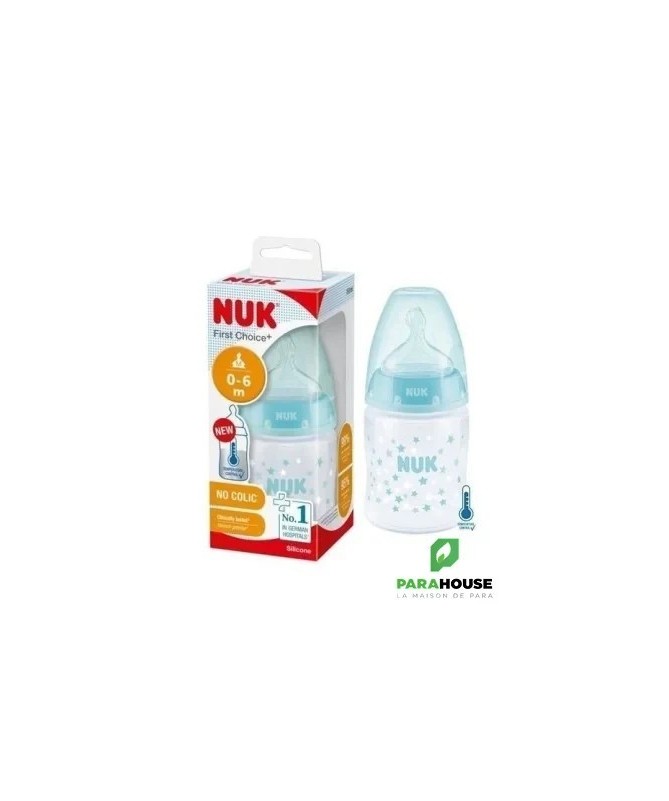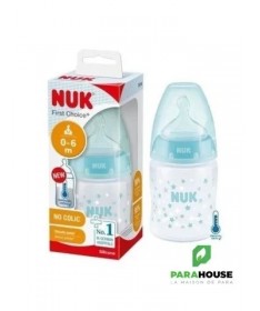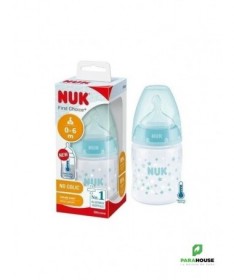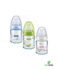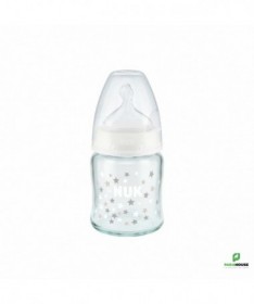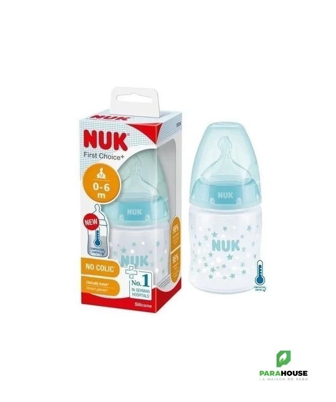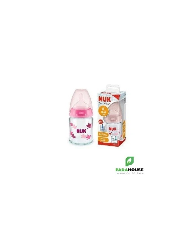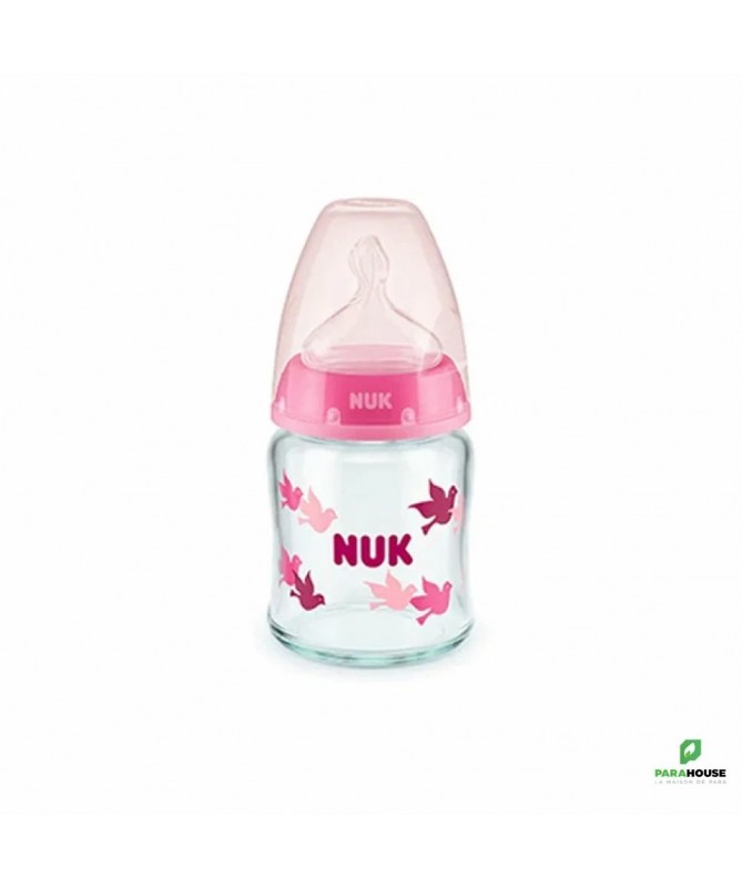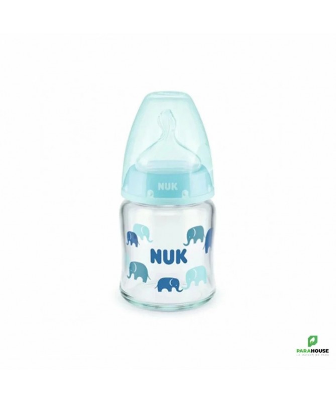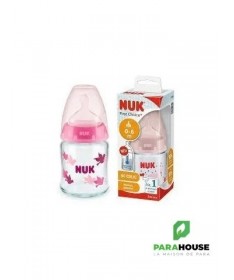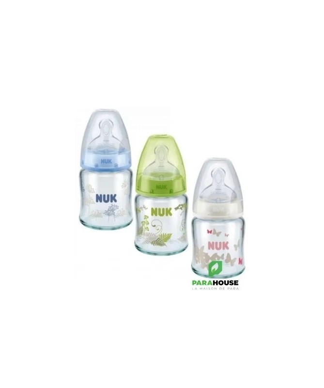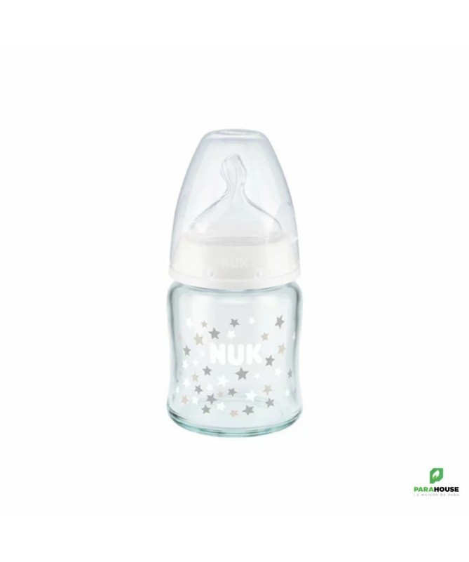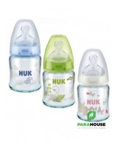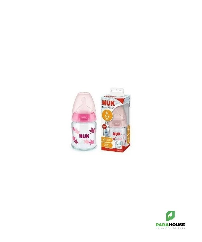 Nuk First Choice 0-6m Verre 120ML Tétine en silicone, particulièrement souple, 0-6 mois, S (perforation fine pour le thé et le lait) Testé cliniquement : idéal pour combiner l’alimentation au biberon et l’allaitement* Prévient les coliques grâce au système anti-colique amélioré Goulot extra-large facilitant le remplissage et le nettoyage Biberon en verre robuste de haute qualité, sans BPA La tétine la plus naturelle pour votre bébé Depuis de nombreuses années, NUK First Choice est le premier choix en matière d'alimentation au biberon selon le modèle de l'allaitement maternel. NUK First Choice+ permet de se rapprocher encore plus de la nature - pour un développement sain de la mâchoire et une sensation de boisson comme au sein maternel. Naturelle et orthodontique La forme spéciale NUK est basée sur le sein de la mère pendant l'allaitement. Elle offre assez d'espace à la langue et à la mâchoire de votre bébé pour une tétée naturelle. Doux comme le sein d’une mère Grâce à sa soft zone, la téterelle en silicone s'adapte encore mieux au palais - pour une sensation de boisson naturelle. Prévient les coliques Le concept Air System anti-coliques amélioré assure un débit naturel, ce qui permet à votre bébé de boire tranquillement sans avaler d'air. Cliniquement prouvé : Grâce à sa forme particulièrement naturelle, la sucette NUK est très bien acceptée par les nourrissons. Elle est donc idéale pour les bébés qui sont aussi bien allaités au sein que nourris au biberon. Biberon en polypropylène léger, incassable : Le goulot extra large des biberons NUK First Choice garantit une facilité optimale lors du remplissage et du nettoyage. La forme légèrement incurvée du biberon facilite la prise en main tandis que sa base large offre une stabilité.