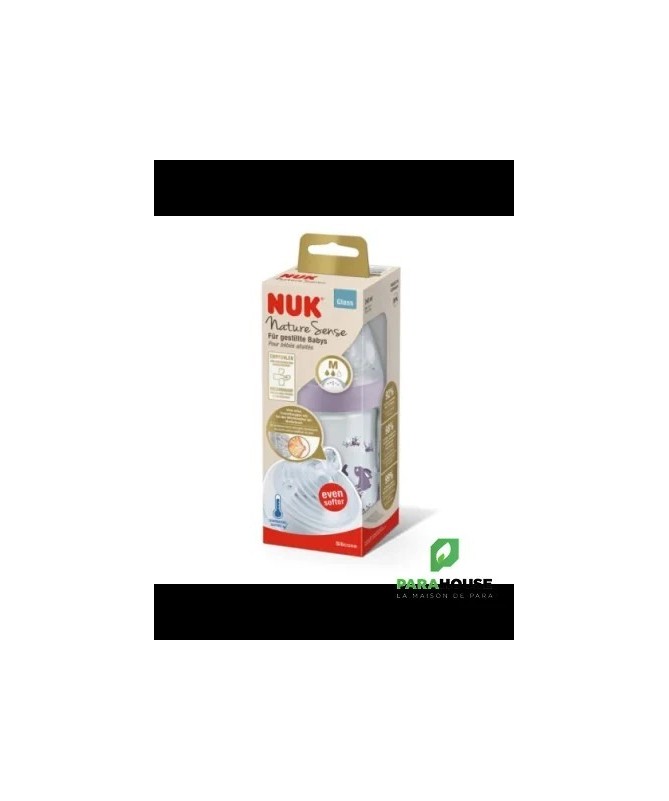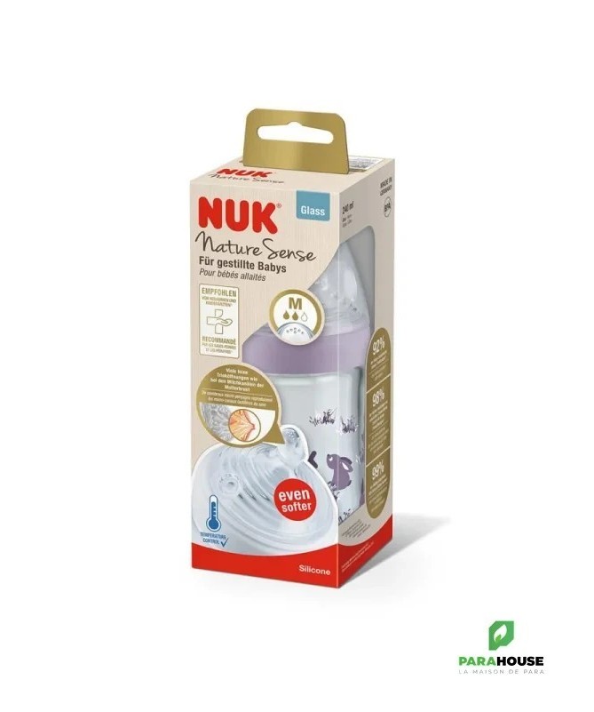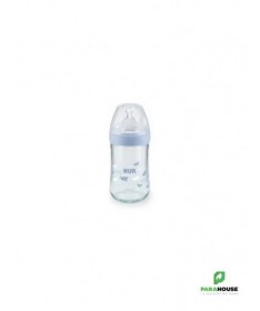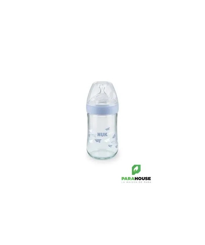 Nous vous proposons le biberon en verre NUK qui est recommandé par 99 % des mamans qu’elles l’ont utilisé.Le biberon NUK est :– contrôle de température– en verre avec un col large– capacité de 240 ml– muni d’une tétine qui simule le sein maternel –– avec une tétine micro-perçage pour un débit de lait doux, régulier et naturel– anti-colique en prévenant l’aspiration de l’airLes statistiques confirment que 92 % des bébés acceptent directement la tétine souple et sans BPA du biberon en verre 240 ml de NUK.