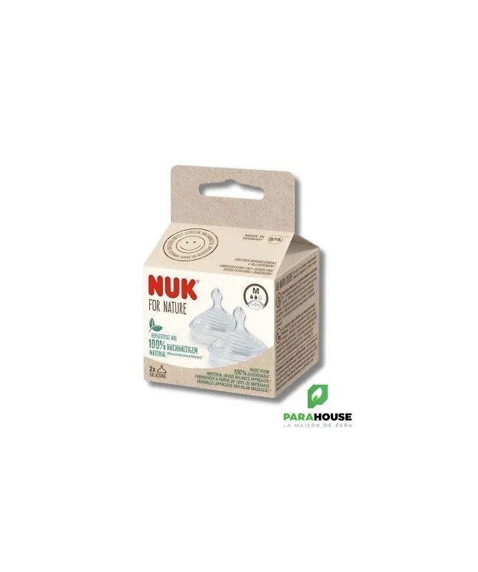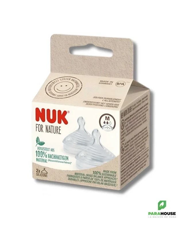 Bénéfices- Succion naturelle :Micro-perçages assurant un débit de lait fluide et naturel, imitant les canaux du sein maternel.- Réduction des coliques :Système anti-colique innovant empêchant l’ingestion d’air pour un confort digestif optimal.- Confort optimal :Base souple et élargie pour une tétée agréable et proche de l’allaitement au sein.- Sécurité :Silicone de haute qualité, sans BPA, pour une utilisation sûre dès la naissance.- Pratique :Lot de deux tétines faciles à nettoyer et compatibles avec les biberons Nuk Nature Sense.IndicationsLa tétine Nuk Nature Sense taille M est recommandée pour les bébés de 0 à 6 mois. Idéale pour les enfants qui alternent allaitement et biberon ou sujets aux coliques.Conseils d’Utilisation- Stérilisation :Avant la première utilisation, stériliser la tétine dans de l’eau bouillante pendant 5 minutes.- Nettoyage régulier :Laver à l’eau tiède avec du savon doux après chaque usage. Peut être stérilisée pour plus d’hygiène.- Vérification :Contrôler l’état de la tétine avant chaque utilisation et la remplacer en cas d’usure.- Conservation :Garder dans un endroit propre et sec lorsqu’elle n’est pas utilisée.- Surveillance :Ne jamais laisser l’enfant sans surveillance lorsqu’il utilise la tétine.