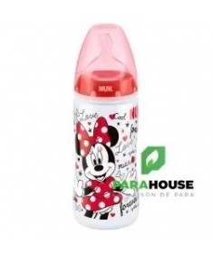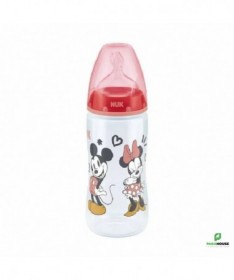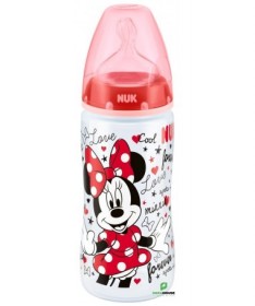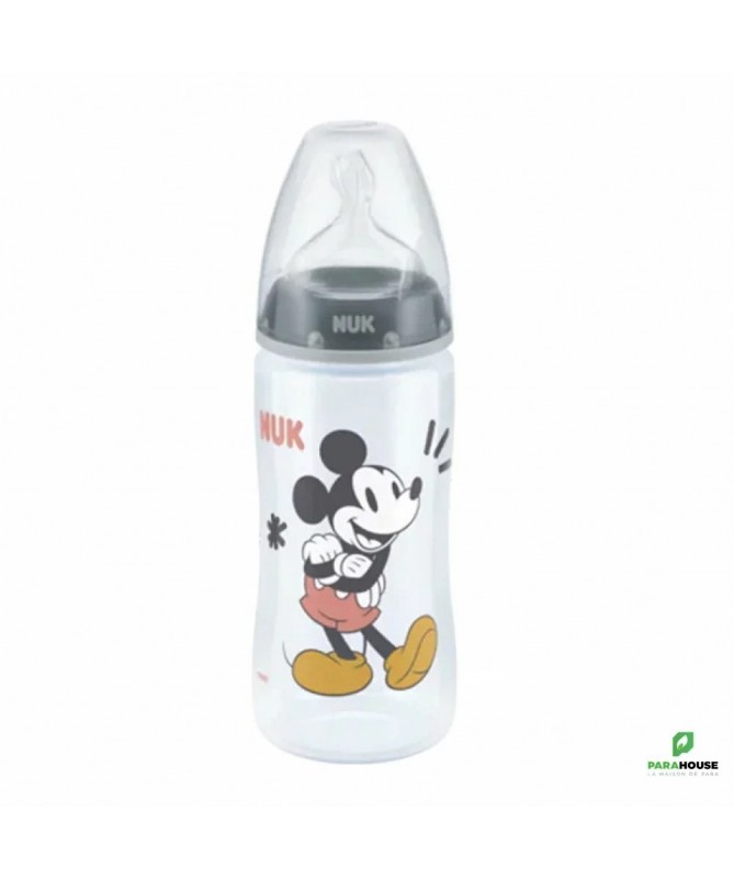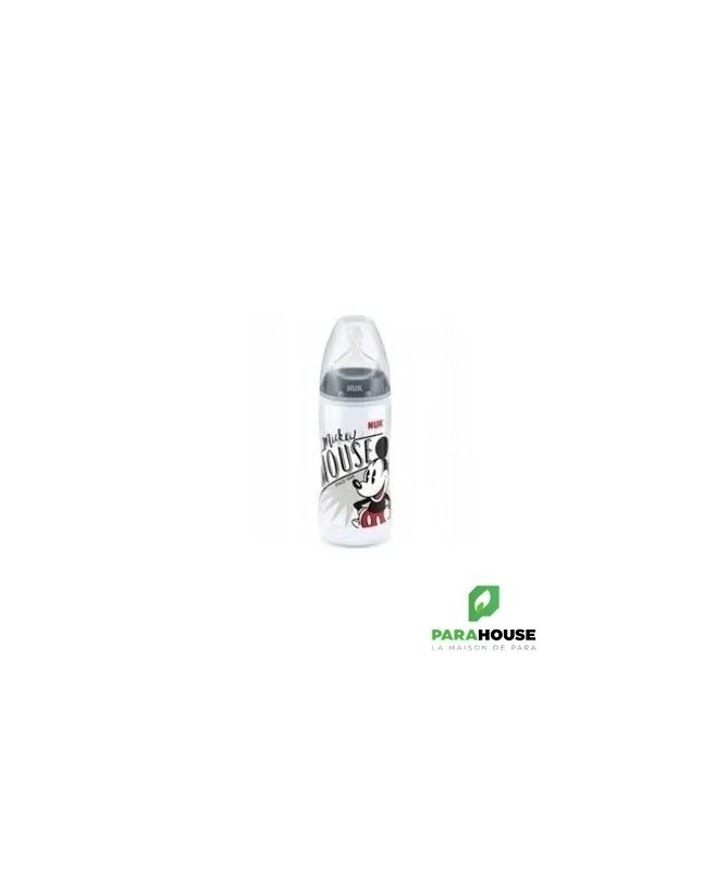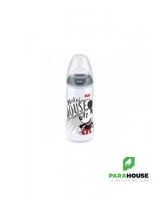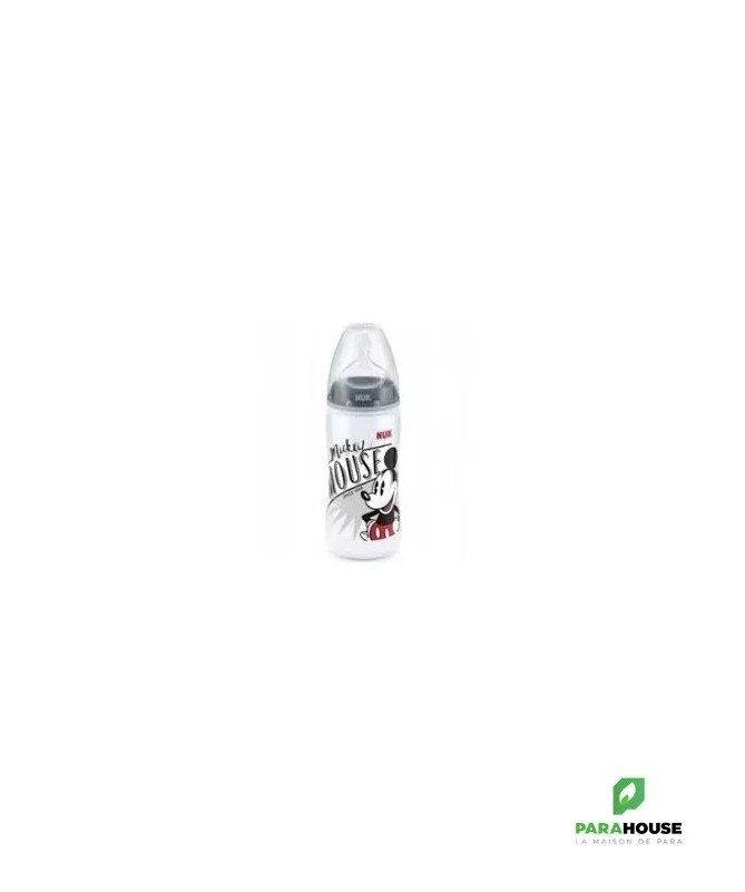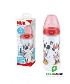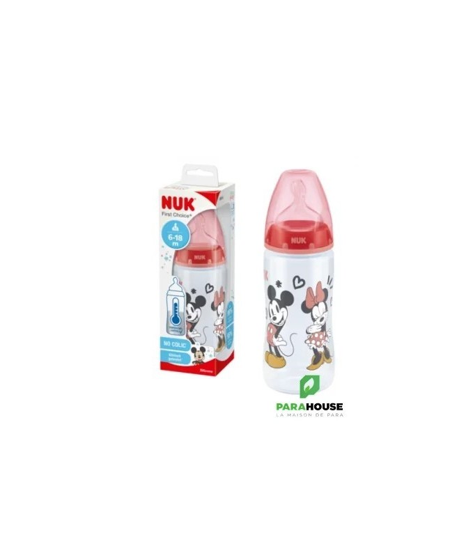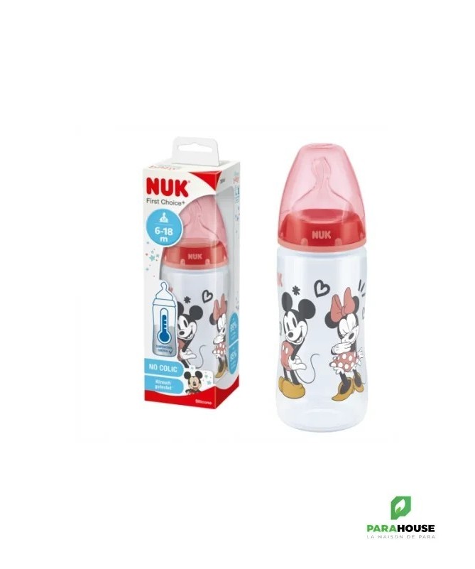 En polypropylène Mickey by Nuk, tétine silicone Nuk first choice+.Coloris rouge.-Recommandé par l'Union Française pour la Santé Bucco-Dentaire (ufsbd).-Sans bisphénol A, conformément à la réglementation en vigueur.-Fabriqué en Allemagne.-Muni d'une tétine physiologique Air System en silicone taille 2 (6-18 mois), perçage M (lait infantile) à base élargie pour que la bouche de bébé se positionne naturellement en butée comme au sein.Par rapport à la tétine Nuk first choice, la tétine fisrt choice+ est encore plus souple grâce à la nouvelle « Soft zone » : L'avant de la tétine suit encore mieux les mouvements du palais de bébé, pour une tétée encore plus naturelle.-Cliniquement prouvé : favorise l'allaitement mixte :La tétine physiologique reproduit la forme du sein pendant la tétée. C'est pourquoi les tétines et biberons Nuk first choice conviendront particulièrement aux mères qui veulent combiner allaitement et biberon.-Réduit les risques de coliquesL'Air System anti-colique de NUK régule l'entrée d'air dans le biberon et empêche la tétine de se rétracter : bébé ne reprend pas son souffle et avale moins d'air, ce qui réduit les risques de coliques et de hoquets.-Ouverture large, pratique pour la préparation et le nettoyage des biberons.-Silhouette ergonomique pour une meilleure prise en main.Conseils d'utilisationLes principales recommandations :Ne pas dépasser un délai d'une heure lorsque le biberon est sorti du réfrigérateur pour sa consommation.Ne pas dépasser un délai de 30 minutes dès lors que le biberon a été réchauffé.Ne pas utiliser de l'eau ayant subi une filtration ou un adoucissement.Ne pas utiliser de l'eau embouteillée provenant d'une bouteille ouverte depuis plus de 24 heures.Ne pas réchauffer le biberon en le laissant à température ambiante, en raison du risque de développement microbien. Utiliser soit le chauffe-biberon, soit le bain-marie.Effectuer la préparation du biberon dans un endroit propre, sur un plan de travail préalablement nettoyé.Il est possible d'utiliser l'eau du robinet si :après ouverture du robinet, un temps d'écoulement (quelques secondes) de l'eau est respecté avant de la recueillir,seule l'eau froide est exclusivement utilisée (attention à la position du mitigeur),le robinet fait l'objet d'un entretien régulier (nettoyage, détartrage),La boîte de lait doit être soigneusement refermée après chaque usage.Il est essentiel d'agiter le biberon pour homogénéiser la température du lait et de vérifier cette dernière en mettant quelques gouttes sur la face interne de l'avant-bras de la personne qui alimente l'enfant avant de proposer le biberon à l'enfant.Après utilisation, vider le biberon, rincer au robinet à l‘eau froide et laver en lave-vaisselle. En l'absence de lave-vaisselle, immerger le biberon et les annexes dans de l'eau chaude additionnée de liquide-vaisselle, nettoyer avec un goupillon, et rincer.La conservation du biberon doit se faire dans un réfrigérateur propre, qui doit être lavé au moins une fois par mois avec de l'eau savonneuse, rincé à l'eau puis à l'eau javellisée.Composition___________________________________0% PBA