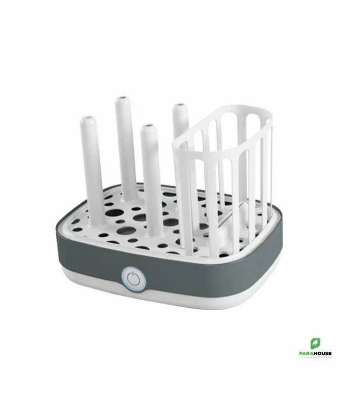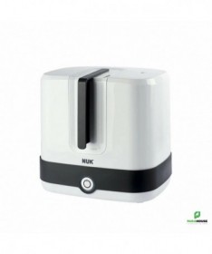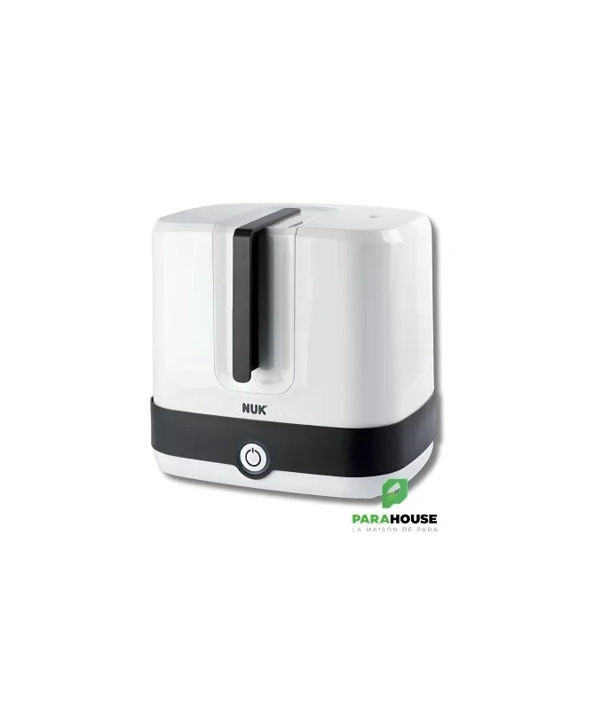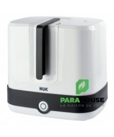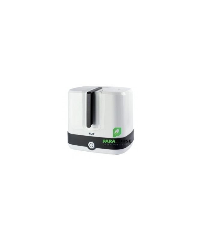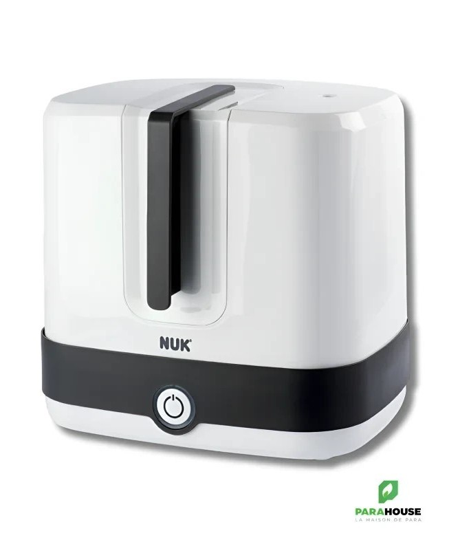 NUK Vario Express Stérilisateur Vapeur NUK Vario Express Stérilisateur Vapeur : Désinfecte jusqu'à 6 biberons et accessoires disponibles dans le commerce, résistants à l'ébullition, de manière fiable en 6 minutes (sans phase de chauffage) à la vapeur. Flexibilité maximale grâce au panier amovible et aux 6 tiges mobiles - pour le remplissage individuel de pièces grandes et petites Design moderne et ergonomique - élégant et convivial Sécurité grâce au voyant lumineux et à l'arrêt automatique Comprend 1 pince à biberon, 1 panier d'accessoires, 1 grille et 6 tiges amovibles Conseils d'utilisation : A Verser 110 ml d'eau dans la base B Placer des tiges et/ou un panier au besoin et mettre les biberons ou les accessoires sur le dessus C Fermer le stérilisateur à vapeur avec le couvercle et lancer le processus de désinfection. D Arrêt automatique (le signal lumineux s'éteint) après la stérilisation