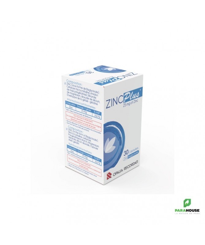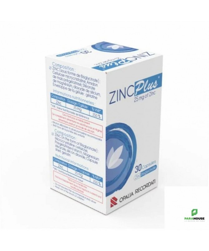 OPALIA RECORDATI ZINC PLUS 25MG 30 GELULES OPALIA RECORDATI ZINC PLUS est un complément alimentaire à base de zinc bisglycinate, jouant un rôle important dans la croissance, la réponse immunitaire, les fonctions neurologiques et reproductives. Il est nécessaire à plus d'une centaine de processus enzymatiques vitaux dans l'organisme. Il participe à la synthèse de l'ADN, de l'ARN et des protéines, aux processus immunitaires, à la réparation des blessures, ainsi qu'à la reproduction. Le zinc joue également un rôle dans la modulation de l'humeur, l'apprentissage, ainsi que dans le goût et l'odorat. Il intervient dans la régulation de la production des hormones thyroïdiennes et dans le métabolisme de l'insuline. Soutient le système immunitaire et réduit l'incidence des infections respiratoires. Favorise la santé de la peau et améliore la cicatrisation. Favorise la santé des cheveux et des ongles. Prévient les troubles du goût et de l'odorat. Améliore la vision. Contribue à une meilleure fertilité. Soutient une fonction cognitive normale. Contribue à la santé de la prostate. Maintient une ossature normale. Maintient un fonctionnement gastro-intestinal équilibré. Contribue à un métabolisme équilibré. Composition : Zinc sous formde de bisglycinate Conseils d'utilisation : Prendre 1 gélule par jour avec un verre d'eau.