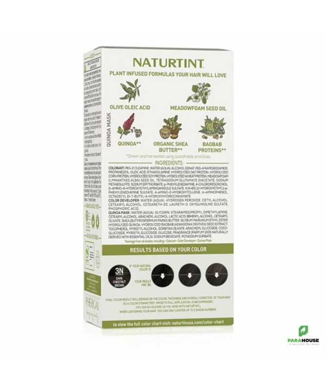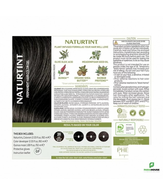 NATURTINT COLORATION PERMANENTE 3N CHATAIN FONCE NATURTINT COLORATION PERMANENTE est une coloration permanente sans ammoniaque choisie par les consommateurs du monde entier qui recherchent douceur, brillance, hydratation et confort maximal du cuir chevelu. Sa formule gel innovante et exclusive enrichie en ingrédients naturels respecte grandement la santé des cheveux. Il comprend également un traitement exclusif MultiCare Quinoa Mask, qui améliore le processus de coloration et augmente la fixation de la couleur de 20 %. Formulée avec jusqu'à 92% d'ingrédients d'origine naturelle, cette coloration vous offre une beauté naturelle sans compromis. Sans ammoniaque, elle respecte votre cuir chevelu et vos cheveux. Avec une couverture des cheveux blancs allant jusqu'à 100%, vous obtiendrez une couleur riche et uniforme. Composition : COLORANT: PEG-2 OLEAMINE. WATER (AQUA). ALCOHOL DENAT. PEG-4 RAPESEEDAMIDE. PROPANEDIOL. OLEIC ACID. ETHANOLAMINE. p-PHENYLENEDIAMINE. HYDROLYZED OAT PROTEIN. HYDROLYZED CORN PROTEIN. HYDROLYZED SOY PROTEIN. HYDROLYZED WHEAT PROTEIN. MEADOWFOAM (LIMNANTHES ALBA) SEED OIL. TETRASODIUM GLUTAMATE DIACETATE. SODIUM METABISULFITE. SODIUM ERYTHORBATE. N,N-BIS (2-HYDROXYETHYL)-p-PHENYLENEDIAMINE SULFATE. 2-AMINO-4-HYDROXYETHYLAMINOANISOLE SULFATE. 4-CHLORORESORCINOL. OCTADECYL DI-T- BUTYL-4-HYDROXYHYDROCINNAMATE. COLOR DEVELOPER: WATER (AQUA). HYDROGEN PEROXIDE. CETYL ALCOHOL. CETEARYL ALCOHOL. CETEARETH-20. LAURETH-3. OXYQUINOLINE SULFATE. PHOSPHORIC ACID QUINOA MASK: WATER (AQUA). CETEARYL ALCOHOL. BEHENTRIMONIUM METHOSULFATE. SHEA (BUTYROSPERMUM PARKII) BUTTER. SILYBUM MARIANUM ETHYL ESTER. HYDROLYZED QUINOA. HYDROLYZED BAOBAB (ADANSONIA DIGITATA) SEED EXTRACT. GLYCERYL STEARATE. TOCOPHEROL. FRAGRANCE (PARFUM). SODIUM BENZOATE. POTASSIUM SORBATE. BENZYL ALCOHOL. CITRIC ACID Conseils d'utilisation : Première étape : Préparez et mélangez votre couleur Assurez-vous que vos cheveux sont secs et propres, car l'accumulation de produits coiffants peut affecter le résultat de votre couleur. Nous vous recommandons de colorer vos cheveux le lendemain du lavage pour laisser à votre cuir chevelu le temps de produire des huiles qui contribuent à le protéger pendant le processus de coloration. Peignez vos cheveux avant application. Portez toujours les gants fournis. Dévissez les capuchons du colorant (A) et du révélateur de couleur (B). Versez tout le contenu de A dans B et remettez le capuchon de B. Agitez le flacon applicateur (B) pendant 2 minutes jusqu'à ce que le mélange soit totalement homogène. Si vous utilisez le flacon applicateur (B) pour mélanger et appliquer, dévissez et retirez IMMÉDIATEMENT l'embout de la buse et passez à l'étape 2 : appliquez votre couleur. Deuxième étape : appliquez votre couleur À l'aide de mains gantées, appliquez d'abord le mélange sur vos racines, en utilisant l'embout du flacon applicateur (B) pour séparer vos cheveux en petites sections. Massez immédiatement le reste du mélange sur le reste de vos cheveux pour vous assurer que le colorant est uniformément réparti. Laisser poser 30 minutes. Pour obtenir une couleur plus intense ou pour couvrir les gris tenaces, augmentez le temps de développement jusqu'à 40 minutes maximum. Troisième étape : rincer et perfectionner Rinçage : après avoir atteint le temps de pose souhaité, à l'aide de mains gantées, massez doucement les cheveux tout en les rinçant abondamment à l'eau tiède jusqu'à ce que l'eau soit parfaitement claire. Assurez-vous qu'aucun gel colorant ne reste dans les cheveux. Si des résidus de couleur persistent, lavez vos cheveux avec un shampooing au pH équilibré, tel que le shampooing Naturtint Color Care, et rincez à nouveau abondamment à l'eau. Tout résidu laissé peut entraîner des résultats indésirables. Appliquez une petite quantité du Masque Multi-Soin (C) sur vos cheveux encore mouillés, en travaillant des racines jusqu'aux pointes pour garantir que tous vos cheveux sont couverts. Il s’agit d’une étape importante dans le processus de candidature et aidera à verrouiller votre nouvelle couleur. Après 3 à 5 minutes, rincez soigneusement vos cheveux pour retirer le masque. Sécher et coiffer comme d'habitude