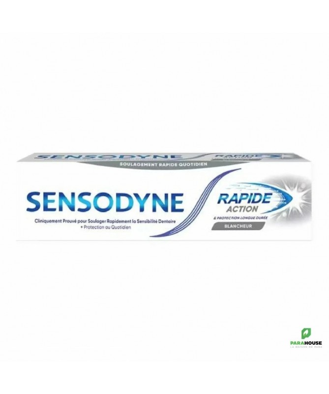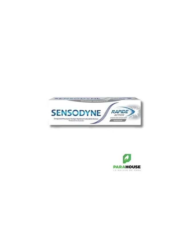 Sensodyne Rapide Action Blancheur Sensodyne Rapide Action Blancheur est le soulagement rapide de la sensibilité dentaire que tu cherchais. La formule à action rapide offre un soulagement de la sensibilité dentaire jusqu'à 60 secondes et aide à prévenir la sensibilité future pour que ton sourire reste fbeau. Doux pour les dents, ce dentifrice au fluorure aide aussi à protéger contre les caries, prévient les taches et donne un goût frais. La meilleure façon de protéger tes dents sensibles est de te brosser les dents régulièrement avec le dentifrice Sensodyne. Laissez Sensodyne Rapid Action t'aider à stopper rapidement les douleurs dentaires. Cette formulation unique forme rapidement une barrière sur les zones sensibles de tes dents, aidant à protéger contre la douleur causée par le froid, la chaleur, les acides, les sucreries et le toucher. Composition : Fluorure d'étain, polymère bio-adhésif et fluorure de sodium (1450 ppm). Agit par obturation des tubuli dentinaires. A conserver à une température inférieure à 25°C. Conseils d'utilisation : Il est recommandé de se brosser les dents avec Sensodyne Rapide Action Blancheur deux fois par jour, et de ne pas dépasser trois brossages.