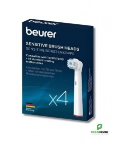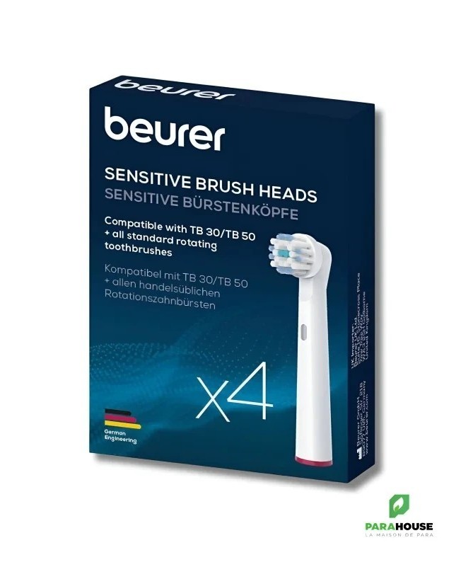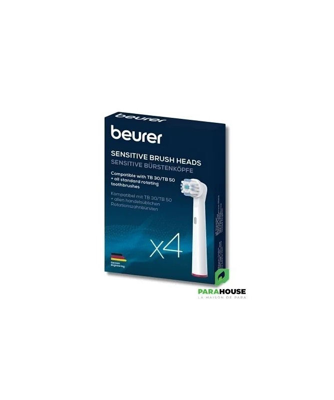 BEURER TB 30 / TB 50 - 4 Brossettes de Rechange SensitiveCes brossettes de rechange Sensitive sont conçues pour les brosses à dents BEURER TB 30 et TB 50, ainsi que pour toutes les brosses rotatives standard. Elles offrent un nettoyage optimal grâce à deux longueurs de poils, assurant des dents propres et des gencives saines.Chaque tête de brosse est équipée d’un capuchon de protection et d’anneaux colorés pour une distinction facile dans les environnements partagés.Caractéristiques :Compatibles avec TB 30, TB 50 et brosses rotatives standardDeux longueurs de poils pour un nettoyage completCapuchon de protection inclusAnneaux colorés pour identifier chaque brossetteDisponible en kits de 4 ou 8 piècesRemplacer tous les 3 mois pour des performances optimalesDimensions : Hauteur 72 mm (74 mm avec capuchon), assiette 13,5 mm, tige 12,2 mm, capuchon 17,5 mm