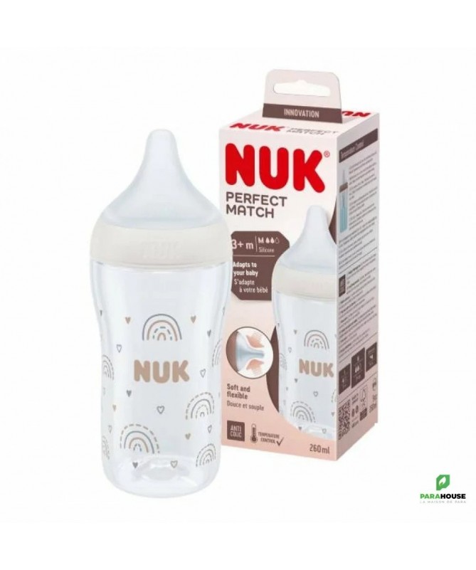 Le Biberon NUK Perfect Match avec Tétine en Silicone Souple 260mlLeBiberon NUK Perfect Match 260mlest spécialement conçu pour offrir confort, sécurité et praticité lors des repas de votre bébé. Fabriqué en plastique de haute qualité, léger et durable, il est parfaitement adapté aux petites mains. Satétine en silicone souplereproduit la sensation du sein maternel, favorisant une tétée naturelle et limitant la confusion sein-biberon.Caractéristiques principales :Capacité de 260 ml :idéale pour les nourrissons et les bébés plus âgés.Tétine en silicone souple :douce, flexible et confortable pour une tétée fluide et naturelle.Technologie anti-colique :système intégré réduisant l’ingestion d’air et les coliques.Design ergonomique :facile à tenir et agréable à utiliser pour les parents et les bébés.Facile à nettoyer :toutes les pièces sont démontables pour un entretien simple et hygiénique.LeBiberon NUK Perfect Matchallie confort, innovation et sécurité pour des repas paisibles et agréables, jour après jour.