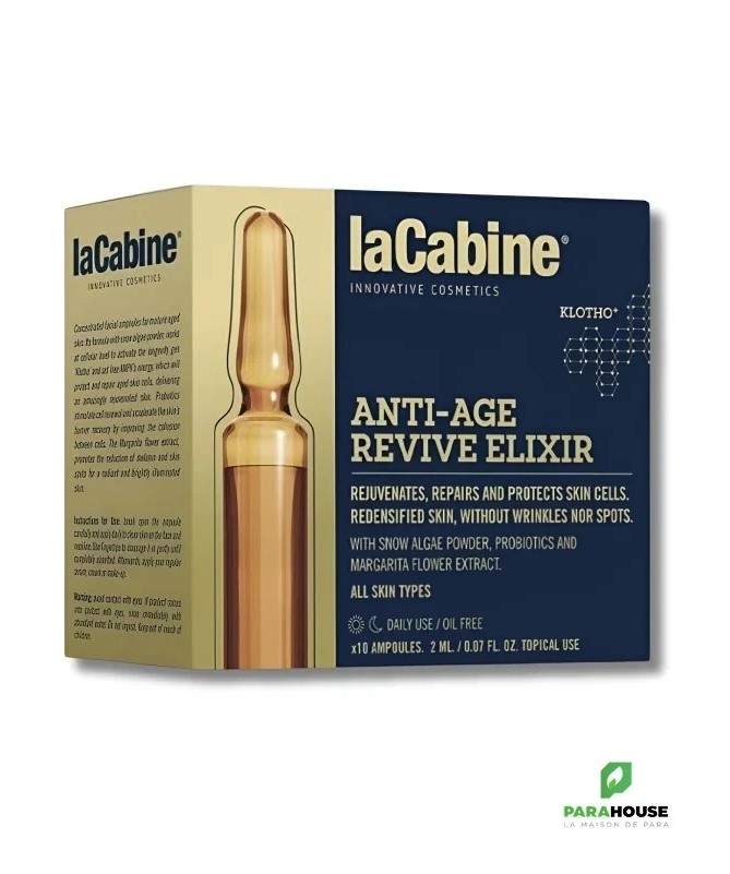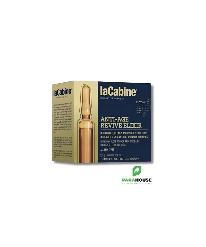 LaCabine Anti-Aging Reviving Elixir 10 AmpoulesDécouvrez LaCabine Anti-Aging Reviving Elixir Ampoules 10x2ml, un sérum innovant qui régénère, protège et illumine votre peau. Conçu pour stimuler les mécanismes cellulaires, il réduit visiblement les signes du vieillissement et redonne éclat et jeunesse au visage.DescriptionCette formule avancée favorise la régénération cellulaire en activant le gène de longévité Klotho. En combinant des actifs naturels et puissants, le sérum réduit la production de mélanine, atténue les imperfections et lisse les rides. Sa texture fluide pénètre rapidement, sans résidu gras, pour une expérience sensorielle agréable.BénéficesRajeunissement cellulaire :Stimule le gène Klotho pour une peau plus jeune.Réduction des rides et imperfections :Lisse la peau et atténue les taches pigmentaires.Protection antioxydante :Protège contre le stress oxydatif et les agressions extérieures.Hydratation et éclat :Améliore la texture et l’hydratation pour un teint lumineux.Action rapide :Résultats visibles dès les premières applications.IndicationsConvient à tous les types de peau, y compris les plus sensibles. Idéal pour prévenir et atténuer les signes du vieillissement cutané.Conseils d’utilisationOuvrez l’ampoule avec l’outil fourni et insérez l’applicateur.Appliquez quelques gouttes sur le visage, le cou et le décolleté après le nettoyage, matin et/ou soir.Massez délicatement jusqu’à absorption complète.Fermez l’ampoule et placez-la sur le piédestal fourni pour une conservation optimale.Complétez votre routine avec votre crème hydratante habituelle.