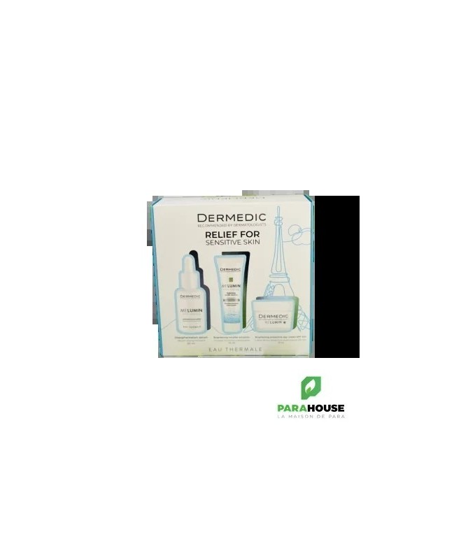 DERMEDIC MELUMIN COFFRET ANTI TACHE DERMEDIC MELUMIN COFFRET ANTI TACHE ; Tout pour un visage resplendissant dans un même coffret. Un coffret beauté Dermedic Melumin fera plaisir à vos proches et à vous aussi. DERMEDIC MELUMIN SERUM DEPIGMENTANT ANTI AGE 30ML : DERMEDIC MELUMIN SERUM DEPIGMENTANT ANTI AGE éclaircit intensément les dyschromies cutanées, les taches et les irrégularités de couleur, prévient la formation de nouvelles taches et stimule le processus de renouvellement de la peau. DERMEDIC MELUMIN Emulsion micellaire éclaircissante 25ML : L'emulsion Micellaire Eclaircissante Dermedic Melumin enrichie d'Ingrédients actifs: Complexe MeluminTM Tristage (Arbutine, Lightderm, Vitamine C, Niacinamide), Acide lactobionique, Glycérine, D-Panthénol. DERMEDIC MELUMIN Crème de jour protectrice éclaircissante SPF50+ 15ML: DERMEDIC MELUMN La crème éclaircissante de jour enrichie Ingrédients actifs pour eclaircir le teint tel que complexe MeluminTM Tristage (arbutine, Lightderm, vitamine C, niacinamide), filtres UV, vitamine E, huile de coco.