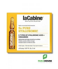 LACABINE 5X PURE HYALURONIC - 10 AMPOULESLes ampoules LaCabine 5x Pure Hyaluronic (10x2ml) sont un soin anti-âge pour peaux matures. Elles combinent cinq types d’acide hyaluronique pur pour hydrater profondément, repulper et réparer la peau.DescriptionCes ampoules offrent une hydratation multi-niveaux grâce à cinq types d’acide hyaluronique pur, agissant en surface et en profondeur pour un effet repulpant immédiat. Enrichies en extrait de noyau d’avoine, vitamine E et autres actifs réparateurs, elles renforcent la barrière cutanée et réparent les cellules endommagées par les agressions extérieures.BénéficesHydratation multi-niveaux et repulpage immédiat grâce aux cinq types d’acide hyaluronique.Raffermissement et réduction des rides pour une peau plus lisse et dense.Réparation des cellules endommagées et action régénérante.Protection contre les agressions extérieures avec des actifs apaisants et réparateurs.IndicationsIdéales pour les peaux matures afin de :Réduire les rides et améliorer la fermeté.Réparer les peaux photo-vieillies et atténuer les signes du vieillissement.Régénérer et hydrater intensément les peaux sèches et ternes.Conseils d’utilisationNettoyez la peau avant application.Appliquez le sérum sur le visage, le cou et le décolleté.Massez doucement pour favoriser l’absorption.Utilisez matin et/ou soir, seul ou avant votre crème habituelle.