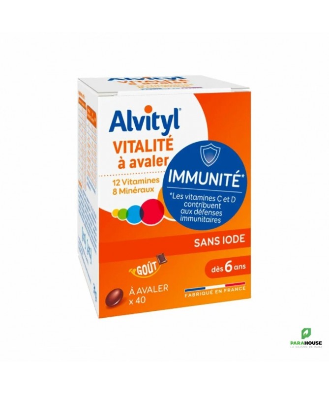 ALVITYL 40 COMPRIMES - 12 vitamines et 8 minéraux Alvityl comprimé est un complément alimentaire spécialement conçu pour aider l'organisme lors de périodes de fatigue passagère, croissance, alimentation déséquilibrée ou manque d'appétit. Sa formule associe vitamines, minéraux et oligo-éléments complémentaires pour : Mieux utiliser l'énergie et les nutriments des aliments consommés (vitamines B1, B2, B3, B5, B8, fer, cuivre, manganèse) Contribuer au fonctionnement des systèmes nerveux (vitamines B1, B3, B6, C, cuivre, zinc) et musculaire (magnesium). Aider au maintien de l'ossature (vitamine D, magnésium, zinc, manganèse). Sa formule associe 12 vitamines et 8 minéraux spécialement dosés pour couvrir 100% des valeurs nutritionnelles de références pour : Assurer à l’organisme forme et vitalité physique grâce aux vitamines B3, B6, B9 et C, au fer et au magnésium qui aident à réduire la fatigue Participer à la croissance osseuse grâce à la vitamine D Composition: A 800 µg B1 1,1 mg B2 1,4 mg B3 (PP) 16 mg B5 6 mg B6 1,4 mg B8 0,05 mg B9 200 µg B12 2,5 µg C 80 mg D3 5 µg E 12 mg Zinc 10 mg Fer 14 mg Cuivre 1 mg Manganèse 1 mg Molybdène 50 µg Sélénium 50 µg Chrome 20 µg Magnésium 57 mg Conseils d'Utilisation : Enfants à partir de 6 ans, adolescents, adultes : 1 comprimé ALVITYL Vitalité par jour à avaler avec un grand verre d’eau. Ne pas croquer. Ne pas dépasser la dose journalière recommandée. A utiliser dans le cadre d’une alimentation équilibrée et un mode de vie sain. Prise de 3 semaines conseillée. A renouveler si nécessaire. A prendre en toute saison. 1 boîte = 40 jours Comprimé petit et facile à avaler.