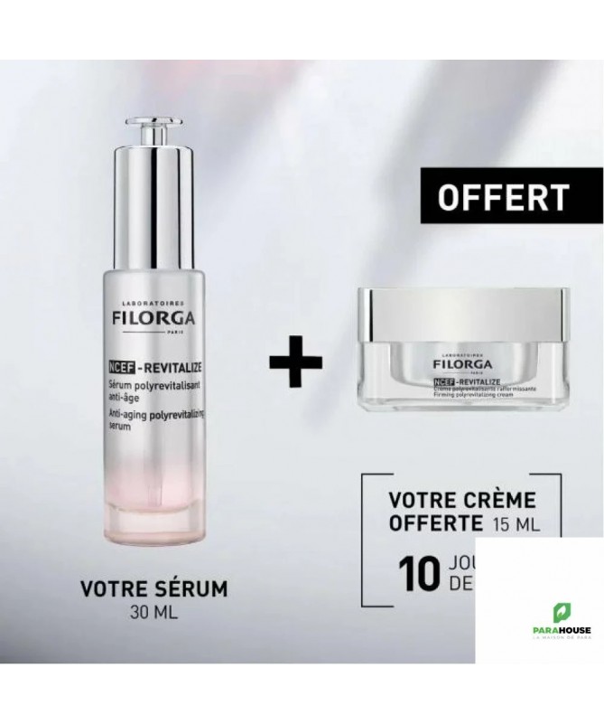 FILORGA COFFRET NCEF REVITALIZE SERUM FILORGA COPACK NCEF REVITALIZE SERUM ; Découvrez l'alliance parfaite du NCEF REVITALIZE SÉRUM et de la crème revitalisante pour une peau transformée et éclatante. FILORGA NCEF REVITALIZE SÉRUM 30ML : Ce sérum revitalisant est hautement concentré en NCEF, un complexe unique exclusivement développé par FILORGA et inspiré des injections anti-âge régénératives. Il combine 10 ingrédients essentiels choisis avec précision (vitamines, acides aminés, co-enzymes…) pour améliorer la production de collagène et d’élastine mais aussi renforcer la protection antioxydante et la barrière cutanée. Grâce à une nouvelle technologie d’encapsulation qui permet une meilleure pénétration des actifs dans la peau (1), son efficacité est libérée au cœur de l’épiderme. FILORGA NCEF REVITALIZE CREME POLYREVITALISANTE RAFFERMISSANTE 15ML OFFERTE : FILORGA NCEF-REVITALIZE CREME POLYREVITALISANTE RAFFERMISSANTE ; La crème anti-âge polyrevitalisante qui lisse les rides et raffermit la peau tout en lui redonnant son tonus et son éclat.