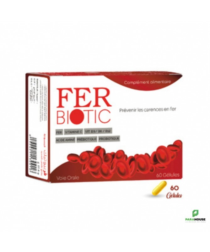 Description :VITAL FERBIOTIC 60 Gélules est un complément alimentaire spécialement conçu pour soutenir le bien-être général, en particulier pour les personnes ayant des besoins accrus en fer. Ce produit combine du fer avec des probiotiques pour favoriser une meilleure absorption et utilisation du fer tout en soutenant la flore intestinale.Indications :Comble les carences en FerCombinaison Acides Aminés, Prébiotique, Probiotique et VitaminesMeilleure Tolérance intestinaleMeilleure AbsorptionMeilleure Biodisponibilité200% VNR EUR/TN en Fer élémentaireIndiqué chez la femme allaitanteIndiqué chez la femme enceinteConseil d’utilisation :Prenez 1 à 2 gélules par jour avec un repas et un grand verre d’eau. Suivez une cure de 3 mois pour un effet optimal. En cas de grossesse ou d’allaitement, consultez un médecin avant utilisation.Composition :Fer (souvent sous forme de bisglycinate ferreux ou autre forme bien absorbée).Probiotiques : souches spécifiques de bactéries bénéfiques pour la santé intestinale (par exemple Lactobacillus ou Bifidobacterium).Excipients : Selon la marque, le produit peut contenir des excipients végétariens, comme de la cellulose pour la gélule.