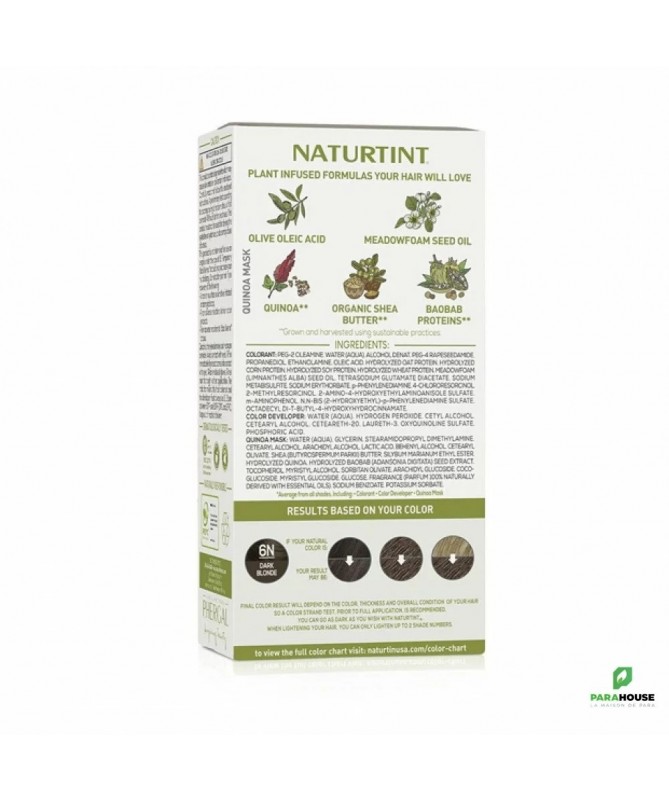 NATURTINT COLORATION PERMANENTE 6N BLOND FONCE NATURTINT COLORATION PERMANENTE est une coloration permanente sans ammoniaque choisie par les consommateurs du monde entier qui recherchent douceur, brillance, hydratation et confort maximal du cuir chevelu. Sa formule gel innovante et exclusive enrichie en ingrédients naturels respecte grandement la santé des cheveux. Il comprend également un traitement exclusif MultiCare Quinoa Mask, qui améliore le processus de coloration et augmente la fixation de la couleur de 20 %. Formulée avec jusqu'à 92% d'ingrédients d'origine naturelle, cette coloration vous offre une beauté naturelle sans compromis. Sans ammoniaque, sans parabènes, elle respecte votre cuir chevelu et vos cheveux. Avec une couverture des cheveux blancs allant jusqu'à 100%, vous obtiendrez une couleur riche et uniforme. Composition : COLORANT: PEG-2 OLEAMINE. WATER (AQUA). ALCOHOL DENAT. PEG-4 RAPESEEDAMIDE. PROPANEDIOL. OLEIC ACID. ETHANOLAMINE. p-PHENYLENEDIAMINE. HYDROLYZED OAT PROTEIN. HYDROLYZED CORN PROTEIN. HYDROLYZED SOY PROTEIN. HYDROLYZED WHEAT PROTEIN. MEADOWFOAM (LIMNANTHES ALBA) SEED OIL. TETRASODIUM GLUTAMATE DIACETATE. SODIUM METABISULFITE. SODIUM ERYTHORBATE. N,N-BIS (2-HYDROXYETHYL)-p-PHENYLENEDIAMINE SULFATE. 2-AMINO-4-HYDROXYETHYLAMINOANISOLE SULFATE. 4-CHLORORESORCINOL. OCTADECYL DI-T- BUTYL-4-HYDROXYHYDROCINNAMATE. COLOR DEVELOPER: WATER (AQUA). HYDROGEN PEROXIDE. CETYL ALCOHOL. CETEARYL ALCOHOL. CETEARETH-20. LAURETH-3. OXYQUINOLINE SULFATE. PHOSPHORIC ACID QUINOA MASK: WATER (AQUA). CETEARYL ALCOHOL. BEHENTRIMONIUM METHOSULFATE. SHEA (BUTYROSPERMUM PARKII) BUTTER. SILYBUM MARIANUM ETHYL ESTER. HYDROLYZED QUINOA. HYDROLYZED BAOBAB (ADANSONIA DIGITATA) SEED EXTRACT. GLYCERYL STEARATE. TOCOPHEROL. FRAGRANCE (PARFUM). SODIUM BENZOATE. POTASSIUM SORBATE. BENZYL ALCOHOL. CITRIC ACID Conseils d'utilisation : Première étape : Préparez et mélangez votre couleur Assurez-vous que vos cheveux sont secs et propres, car l'accumulation de produits coiffants peut affecter le résultat de votre couleur. Nous vous recommandons de colorer vos cheveux le lendemain du lavage pour laisser à votre cuir chevelu le temps de produire des huiles qui contribuent à le protéger pendant le processus de coloration. Peignez vos cheveux avant application. Portez toujours les gants fournis. Dévissez les capuchons du colorant (A) et du révélateur de couleur (B). Versez tout le contenu de A dans B et remettez le capuchon de B. Agitez le flacon applicateur (B) pendant 2 minutes jusqu'à ce que le mélange soit totalement homogène. Si vous utilisez le flacon applicateur (B) pour mélanger et appliquer, dévissez et retirez IMMÉDIATEMENT l'embout de la buse et passez à l'étape 2 : appliquez votre couleur. Deuxième étape : appliquez votre couleur À l'aide de mains gantées, appliquez d'abord le mélange sur vos racines, en utilisant l'embout du flacon applicateur (B) pour séparer vos cheveux en petites sections. Massez immédiatement le reste du mélange sur le reste de vos cheveux pour vous assurer que le colorant est uniformément réparti. Laisser poser 30 minutes. Pour obtenir une couleur plus intense ou pour couvrir les gris tenaces, augmentez le temps de développement jusqu'à 40 minutes maximum. Troisième étape : rincer et perfectionner Rinçage : après avoir atteint le temps de pose souhaité, à l'aide de mains gantées, massez doucement les cheveux tout en les rinçant abondamment à l'eau tiède jusqu'à ce que l'eau soit parfaitement claire. Assurez-vous qu'aucun gel colorant ne reste dans les cheveux. Si des résidus de couleur persistent, lavez vos cheveux avec un shampooing au pH équilibré, tel que le shampooing Naturtint Color Care, et rincez à nouveau abondamment à l'eau. Tout résidu laissé peut entraîner des résultats indésirables. Appliquez une petite quantité du Masque Multi-Soin (C) sur vos cheveux encore mouillés, en travaillant des racines jusqu'aux pointes pour garantir que tous vos cheveux sont couverts. Il s’agit d’une étape importante dans le processus de candidature et aidera à verrouiller votre nouvelle couleur. Après 3 à 5 minutes, rincez soigneusement vos cheveux pour retirer le masque. Sécher et coiffer comme d'habitude