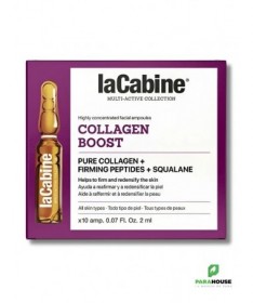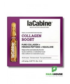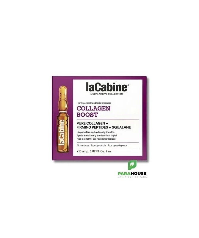 La Cabine Anti-Âge Collagen Boost 10 AmpoulesLes ampoules La Cabine Anti-Âge Collagen Boost raffermissent et restructurent le contour du visage tout en stimulant la production naturelle de collagène. Grâce à la coenzyme Q10 et à l’extrait de Wu-Zhu-Yu, elles aident à prévenir le vieillissement prématuré, détoxifient et tonifient la peau.IndicationsTous types de peaux.Conseils d’utilisationOuvrir l’ampoule à l’aide de l’outil fourni, puis installer l’applicateur. Prélever la quantité souhaitée avec la tétine. Appliquer matin et/ou soir, après le nettoyage, sur le visage, le cou et le décolleté en massant délicatement. Refermer l’ampoule et la placer sur son support.CompositionAqua (eau), glycérine, squalane, triglycéride caprylique/caprique, citrate d’oléate de glycéryle, collagène hydrolysé, gomme de biosaccharide-4, palmitoyl tripeptide-5, carnosine, extrait d’acmella olezacea, palmitoyl tetrapeptide-72 amide, caprylyl glycol, éthylhexylglycérine, lécithine, extrait de noyau d’avena sativa (avoine), gomme xanthane, copolymère d’acrylates de sodium, 1,2-hexanediol, edta disodique, parfum, triéthylène glycol, phénoxyéthanol, alcool phénéthylique.