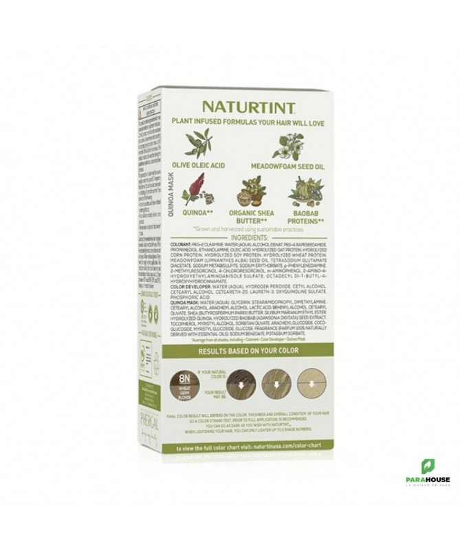NATURTINT COLORATION PERMANENTE 8N BLE BLOND NATURTINT COLORATION PERMANENTE est une coloration permanente sans ammoniaque choisie par les consommateurs du monde entier qui recherchent douceur, brillance, hydratation et confort maximal du cuir chevelu. Sa formule gel innovante et exclusive enrichie en ingrédients naturels respecte grandement la santé des cheveux. Il comprend également un traitement exclusif MultiCare Quinoa Mask, qui améliore le processus de coloration et augmente la fixation de la couleur de 20 %. Formulée avec jusqu'à 92% d'ingrédients d'origine naturelle, cette coloration vous offre une beauté naturelle sans compromis. Sans ammoniaque, elle respecte votre cuir chevelu et vos cheveux. Avec une couverture des cheveux blancs allant jusqu'à 100%, vous obtiendrez une couleur riche et uniforme. Composition : COLORANT: PEG-2 OLEAMINE. WATER (AQUA). ALCOHOL DENAT. PEG-4 RAPESEEDAMIDE. PROPANEDIOL. OLEIC ACID. ETHANOLAMINE. p-PHENYLENEDIAMINE. HYDROLYZED OAT PROTEIN. HYDROLYZED CORN PROTEIN. HYDROLYZED SOY PROTEIN. HYDROLYZED WHEAT PROTEIN. MEADOWFOAM (LIMNANTHES ALBA) SEED OIL. TETRASODIUM GLUTAMATE DIACETATE. SODIUM METABISULFITE. SODIUM ERYTHORBATE. N,N-BIS (2-HYDROXYETHYL)-p-PHENYLENEDIAMINE SULFATE. 2-AMINO-4-HYDROXYETHYLAMINOANISOLE SULFATE. 4-CHLORORESORCINOL. OCTADECYL DI-T- BUTYL-4-HYDROXYHYDROCINNAMATE. COLOR DEVELOPER: WATER (AQUA). HYDROGEN PEROXIDE. CETYL ALCOHOL. CETEARYL ALCOHOL. CETEARETH-20. LAURETH-3. OXYQUINOLINE SULFATE. PHOSPHORIC ACID QUINOA MASK: WATER (AQUA). CETEARYL ALCOHOL. BEHENTRIMONIUM METHOSULFATE. SHEA (BUTYROSPERMUM PARKII) BUTTER. SILYBUM MARIANUM ETHYL ESTER. HYDROLYZED QUINOA. HYDROLYZED BAOBAB (ADANSONIA DIGITATA) SEED EXTRACT. GLYCERYL STEARATE. TOCOPHEROL. FRAGRANCE (PARFUM). SODIUM BENZOATE. POTASSIUM SORBATE. BENZYL ALCOHOL. CITRIC ACID Conseils d'utilisation : Première étape : Préparez et mélangez votre couleur Assurez-vous que vos cheveux sont secs et propres, car l'accumulation de produits coiffants peut affecter le résultat de votre couleur. Nous vous recommandons de colorer vos cheveux le lendemain du lavage pour laisser à votre cuir chevelu le temps de produire des huiles qui contribuent à le protéger pendant le processus de coloration. Peignez vos cheveux avant application. Portez toujours les gants fournis. Dévissez les capuchons du colorant (A) et du révélateur de couleur (B). Versez tout le contenu de A dans B et remettez le capuchon de B. Agitez le flacon applicateur (B) pendant 2 minutes jusqu'à ce que le mélange soit totalement homogène. Si vous utilisez le flacon applicateur (B) pour mélanger et appliquer, dévissez et retirez IMMÉDIATEMENT l'embout de la buse et passez à l'étape 2 : appliquez votre couleur. Deuxième étape : appliquez votre couleur À l'aide de mains gantées, appliquez d'abord le mélange sur vos racines, en utilisant l'embout du flacon applicateur (B) pour séparer vos cheveux en petites sections. Massez immédiatement le reste du mélange sur le reste de vos cheveux pour vous assurer que le colorant est uniformément réparti. Laisser poser 30 minutes. Pour obtenir une couleur plus intense ou pour couvrir les gris tenaces, augmentez le temps de développement jusqu'à 40 minutes maximum. Troisième étape : rincer et perfectionner Rinçage : après avoir atteint le temps de pose souhaité, à l'aide de mains gantées, massez doucement les cheveux tout en les rinçant abondamment à l'eau tiède jusqu'à ce que l'eau soit parfaitement claire. Assurez-vous qu'aucun gel colorant ne reste dans les cheveux. Si des résidus de couleur persistent, lavez vos cheveux avec un shampooing au pH équilibré, tel que le shampooing Naturtint Color Care, et rincez à nouveau abondamment à l'eau. Tout résidu laissé peut entraîner des résultats indésirables. Appliquez une petite quantité du Masque Multi-Soin (C) sur vos cheveux encore mouillés, en travaillant des racines jusqu'aux pointes pour garantir que tous vos cheveux sont couverts. Il s’agit d’une étape importante dans le processus de candidature et aidera à verrouiller votre nouvelle couleur. Après 3 à 5 minutes, rincez soigneusement vos cheveux pour retirer le masque. Sécher et coiffer comme d'habitude