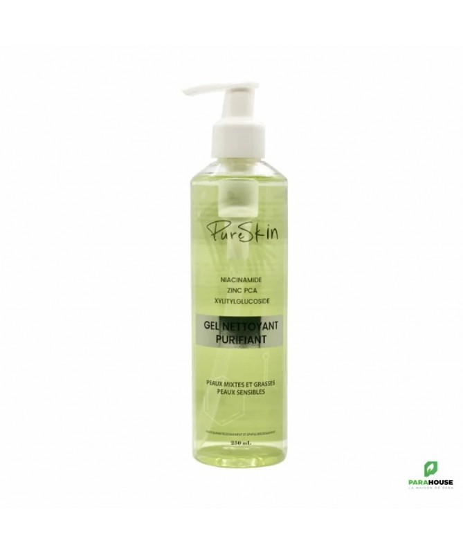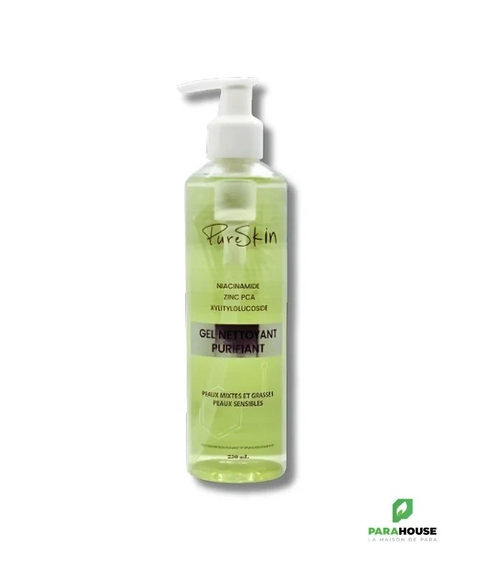 PURE SKIN GEL NETTOYANT PURIFIANT 250ML PURE SKIN GEL NETTOYANT PURIFIANT est un nettoyant quotidien, sans savon, sans sulfates, destiné aux peaux mixtes à grasses sujettes aux imperfections. Il convient également aux peaux sensibilisées par les traitements d'acné. Sa formule enrichie en niacinamide, zinc PCA et xylitylglucoside permet de purifier la peau en profondeur, de réguler la production de sébum et d'absorber l'excès de graisse sans irriter. La niacinamide aide à apaiser et à équilibrer la peau, tandis que le zinc PCA agit pour réduire l'apparition des imperfections et diminue la taille des pores dilatés. Action matifiante de quelques heures. Coup d’éclat immédiat dès la première utilisation. PURE SKIN GEL NETTOYANT PURIFIANT est idéal pour les peaux sujettes aux imperfections, tout en offrant douceur et confort pour un teint frais, net et équilibré. Composition : Eau, Decyl Glucoside, Coco-Glucoside, Glycérine, Cocomido-Propyl Betaine, Sodium C12-14 Olefin Sulfonate, Niacinamide, Xylitylglucoside, Zinc PCA, Anhydroxylitol, Xylitol, PEG-150 Pentaerythrityl Tetra Stearate, PPG-2 Hydroxyethyl Cocamide, Acide Citrique, Benzyl Alcohol, Acide Déhydroacétique, EDTA, Parfum. Conseil d'utilisation : Appliquer matin et soir sur une peau humidifieé ou démaquillé, puis rincer à l'eau claire . Peut s’utiliser sur le corps et le cuir chevelu. Convient à tout âge, aux femmes enceintes et allaitantes .
