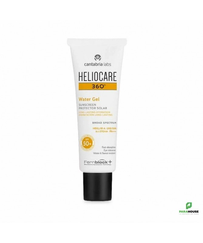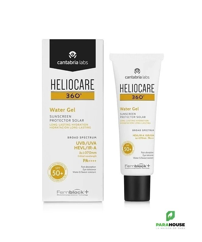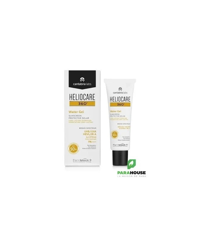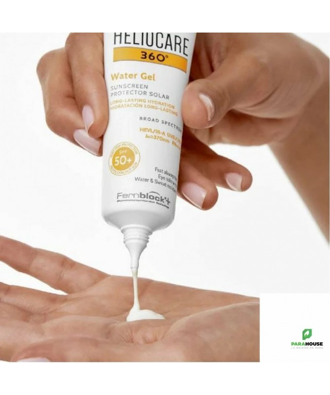 Heliocare 360 Water Gel SPF50+ 50ML Heliocare 360 Water Gel SPF50+ est un gel à base d'eau intensément hydratant qui pénètre rapidement dans la peau avec une finition mate à peine visible - parfait pour ceux qui superposent plusieurs produits de soin et de maquillage le matin. Son système d'hydratation avancé aide à retenir l'hydratation tout en offrant à la peau une barrière contre la pollution. Heliocare 360 Water Gel convient à tous les types de peau, même les peaux les plus sensibles et pour une utilisation autour des yeux sensibles. La finition complètement transparente en fait également un excellent choix pour ceux qui ont la peau de couleur et un choix populaire pour les hommes. Heliocare 360 water gel spf50+ : Protège contre les UVA, UVB, lumière visible et infrarouge-A avec SPF50 et PA++++ : Fernblock® antioxydant suralimenté protège la santé de la peau Enzymes de réparation de l'ADN Anti-oxydants supplémentaires Vitamines C et E plus extrait de thé vert Composition : Ingredients: Aqua; Octocrylene; Ethylhexyl Salicylate; Butyl Methoxydibenzoylmethane; Butylene Glycol; Phenylbenzimidazole Sulfonic Acid; Arginine; Dimethicone; Diethylamino Hydroxybenzoyl Hexyl Benzoate; Phenethyl Benzoate; Silica; Tris-Biphenyl Triazine(nano); Polymethylsilsesquioxane; Styrene/Acrylates Copolymer; Polypodium leucotomos Leaf Extract; Ethylhexyl Triazone; Physalis angulata Extract; Plankton Extract; Melanin; Oxothiazolidine; Sodium Hyaluronate; Glycerin; Trehalose; Urea; Serine; Pullulan; Algin; C20-22 Alkyl phosphate; Phenylpropanol; C20-22 Alcohols; VP/Acrylates/Lauryl Methacrylate Copolymer; Sodium Acrylates Crosspolymer-2; Acrylates/C10-30 Alkyl Acrylate Crosspolymer; Propylene Glycol; Caprylyl Glycol; Propanediol; Pentylene Glycol; Methicone; Caprylic/Capric Triglyceride; Disodium Phosphate; Glyceryl Polyacrylate; Disodium EDTA; Tocopheryl Acetate; Potassium Phosphate; Lecithin; BHT; Sodium Benzoate; Tocopherol; Phenoxyethanol; Parfum; Linalool; Limonene. Conseils d'utilisation : Agiter avant utilisation. Appliquez environ deux longueurs complètes sur le visage en veillant à appliquer le produit uniformément. Assurez-vous d'obtenir une couverture complète jusqu'à la racine des cheveux et autour des yeux, en prenant soin de ne pas mettre de produit dans les yeux. Renouveler l'application toutes les 2 heures en période de forte exposition, après avoir transpiré, nagé ou essuyé la peau