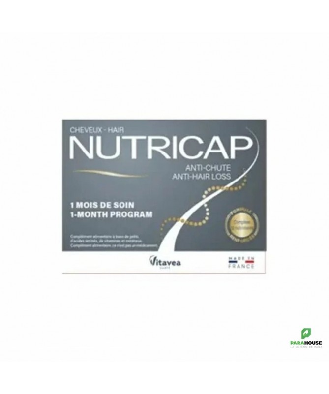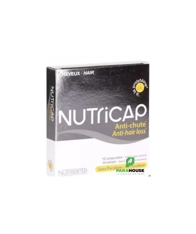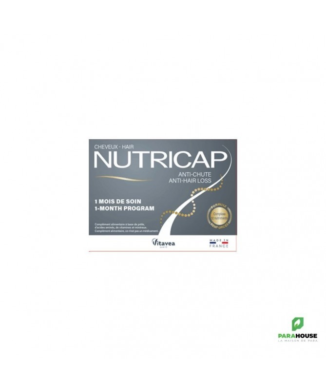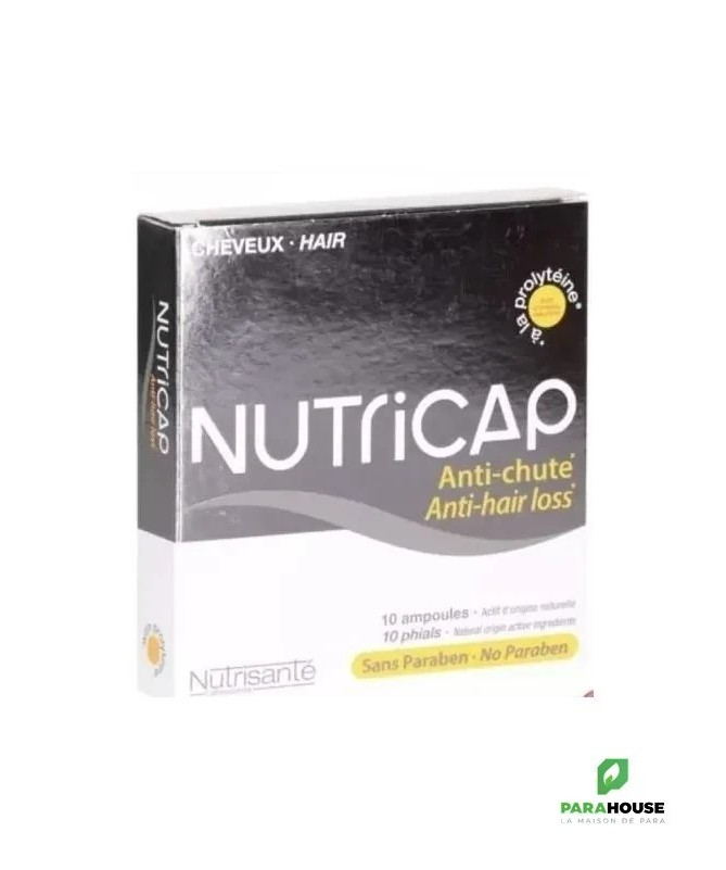 Nutricap Anti-chute est la solution complète pour la croissance des cheveux.Nutricap Croissance est un complément alimentaire, sa formule exclusive apporte une réponse complète en agissant sur la santé des cheveux, notamment grâce à la biotine qui contribue au maintien des cheveux lors des changements environnementaux ou physiologiques (variation saisonnière, stress, fatigue passagère, changements, perte de poids, etc.).Conseil d'utilisation:Cure d'1 mois - 30 capsulesIngrédients :Maltodextrine, L-lysine, L-cystine, capsule d’origine végétale (dérivé de cellulose), L-méthionine, anti-agglomérants : sels de magnésium d’acides gras, carbonate de magnésium, extrait de prêle enrichi en silice (Equisetum arvense), vitamine E naturelle, vitamine B3, minéral : oxyde de zinc, vitamine B5, minéral : bisglycinate de cuivre, vitamines : D, B6, B9, B8
