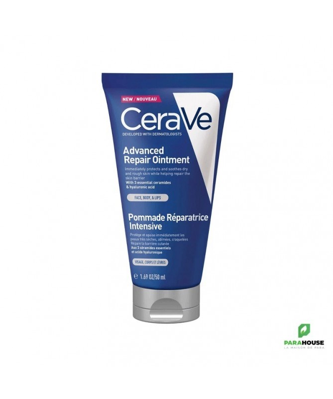 Description :Soin réparateur protecteur pour les peaux très sèches, abîmées, craqueléesDéveloppé avec des dermatologues, la Pommade Réparatrice Intensive de CeraVe est un soin multi-usages qui apaise, protège et répare immédiatement les peaux très sèches, abîmées, craquelées. Ce soin réparateur s'applique sur le visage, le corps et les lèvres.Enrichi aux 3 céramides essentiels naturellement présents dans la peau et à l'acide hyaluronique, ce soin restaure la barrière cutanée. Sa texture pommade semi-occlusive forme une barrière protectrice, comme un « effet pansement », pour protéger les peaux abîmées tout en permettant à la peau de "respirer". Enfin, le panthénol permet d'apaiser immédiatement les sensations d'inconfort.Sa formule haute tolérance testée sous contrôle dermatologique convient pour les peaux très sèches et abimées Sans parfum. Hypoallergénique.Non comédogène. Texture transparente non collante. Pour toute la famille (dès 1 mois).Bénéfices :Développé avec des dermatologues, la Pommade Réparatrice Intensive de CeraVe est un soin multi-usages qui apaise, protège et répare immédiatement les peaux très sèches, abîmées, craquelées. Ce soin réparateur s'applique sur le visage, le corps et les lèvres.Enrichi aux 3 céramides essentiels naturellement présents dans la peau et à l'acide hyaluronique, ce soin restaure la barrière cutanée. Sa texture pommade semi-occlusive forme une barrière protectrice, comme un « effet pansement », pour protéger les peaux abîmées tout en permettant à la peau de "respirer". Enfin, le panthénol permet d'apaiser immédiatement les sensations d'inconfortSa formule haute tolérance testée sous contrôle dermatologique convient pour les peaux très sèches et abimées Sans parfum. Hypoallergénique.Non comédogène. Texture transparente non collante. Pour toute la famille (dès 1 mois).Conseils D'utilisation :Appliquer sur le visage, le corps et les lèvres autant que nécessaire. Éviter le contact direct avec les yeux. En cas de contact, rincer abondamment à l’eau. Appliquer sur peau saine.Composition :20215042 27 - INGREDIENTS: PETROLATUM, PARAFFINUM LIQUIDUM / MINERAL OIL, CERA MICROCRISTALLINA / MICROCRYSTALLINE WAX, PARAFFIN, CAPRYLIC/CAPRIC TRIGLYCERIDE, DIMETHICONE, AQUA / WATER, CERAMIDE NP, CERAMIDE AP, CERAMIDE EOP, CARBOMER, TRIETHYL CITRATE, SODIUM LAUROYL LACTYLATE, SODIUM HYALURONATE, CHOLESTEROL, TOCOPHERYL ACETATE, OCOPHEROL, CAPRYLYL GLYCOL, SYNTHETIC WAX, PANTHENOL, PHYTOSPHINGOSINE, XANTHAN GUM, BENZOIC ACID (F.I.L. Y70029424/1).
