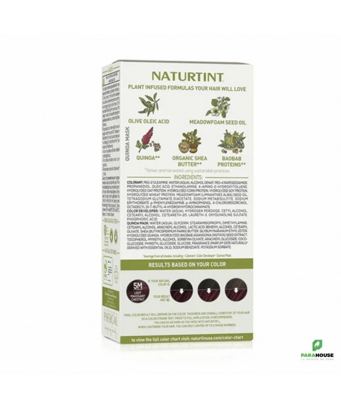 NATURTINT COLORATION PERMANENTE 5M CHATAIN CLAIR ACAJOU NATURTINT COLORATION PERMANENTE est une coloration permanente sans ammoniaque choisie par les consommateurs du monde entier qui recherchent douceur, brillance, hydratation et confort maximal du cuir chevelu. Sa formule gel innovante et exclusive enrichie en ingrédients naturels respecte grandement la santé des cheveux. Il comprend également un traitement exclusif MultiCare Quinoa Mask, qui améliore le processus de coloration et augmente la fixation de la couleur de 20 %. Formulée avec jusqu'à 92% d'ingrédients d'origine naturelle, cette coloration vous offre une beauté naturelle sans compromis. Sans ammoniaque, elle respecte votre cuir chevelu et vos cheveux. Avec une couverture des cheveux blancs allant jusqu'à 100%, vous obtiendrez une couleur riche et uniforme. Composition : COLORANT: PEG-2 OLEAMINE. WATER (AQUA). ALCOHOL DENAT. PEG-4 RAPESEEDAMIDE. PROPANEDIOL. OLEIC ACID. ETHANOLAMINE. p-PHENYLENEDIAMINE. HYDROLYZED OAT PROTEIN. HYDROLYZED CORN PROTEIN. HYDROLYZED SOY PROTEIN. HYDROLYZED WHEAT PROTEIN. MEADOWFOAM (LIMNANTHES ALBA) SEED OIL. TETRASODIUM GLUTAMATE DIACETATE. SODIUM METABISULFITE. SODIUM ERYTHORBATE. N,N-BIS (2-HYDROXYETHYL)-p-PHENYLENEDIAMINE SULFATE. 2-AMINO-4-HYDROXYETHYLAMINOANISOLE SULFATE. 4-CHLORORESORCINOL. OCTADECYL DI-T- BUTYL-4-HYDROXYHYDROCINNAMATE. COLOR DEVELOPER: WATER (AQUA). HYDROGEN PEROXIDE. CETYL ALCOHOL. CETEARYL ALCOHOL. CETEARETH-20. LAURETH-3. OXYQUINOLINE SULFATE. PHOSPHORIC ACID QUINOA MASK: WATER (AQUA). CETEARYL ALCOHOL. BEHENTRIMONIUM METHOSULFATE. SHEA (BUTYROSPERMUM PARKII) BUTTER. SILYBUM MARIANUM ETHYL ESTER. HYDROLYZED QUINOA. HYDROLYZED BAOBAB (ADANSONIA DIGITATA) SEED EXTRACT. GLYCERYL STEARATE. TOCOPHEROL. FRAGRANCE (PARFUM). SODIUM BENZOATE. POTASSIUM SORBATE. BENZYL ALCOHOL. CITRIC ACID Conseils d'utilisation : Première étape : Préparez et mélangez votre couleur Assurez-vous que vos cheveux sont secs et propres, car l'accumulation de produits coiffants peut affecter le résultat de votre couleur. Nous vous recommandons de colorer vos cheveux le lendemain du lavage pour laisser à votre cuir chevelu le temps de produire des huiles qui contribuent à le protéger pendant le processus de coloration. Peignez vos cheveux avant application. Portez toujours les gants fournis. Dévissez les capuchons du colorant (A) et du révélateur de couleur (B). Versez tout le contenu de A dans B et remettez le capuchon de B. Agitez le flacon applicateur (B) pendant 2 minutes jusqu'à ce que le mélange soit totalement homogène. Si vous utilisez le flacon applicateur (B) pour mélanger et appliquer, dévissez et retirez IMMÉDIATEMENT l'embout de la buse et passez à l'étape 2 : appliquez votre couleur. Deuxième étape : appliquez votre couleur À l'aide de mains gantées, appliquez d'abord le mélange sur vos racines, en utilisant l'embout du flacon applicateur (B) pour séparer vos cheveux en petites sections. Massez immédiatement le reste du mélange sur le reste de vos cheveux pour vous assurer que le colorant est uniformément réparti. Laisser poser 30 minutes. Pour obtenir une couleur plus intense ou pour couvrir les gris tenaces, augmentez le temps de développement jusqu'à 40 minutes maximum. Troisième étape : rincer et perfectionner Rinçage : après avoir atteint le temps de pose souhaité, à l'aide de mains gantées, massez doucement les cheveux tout en les rinçant abondamment à l'eau tiède jusqu'à ce que l'eau soit parfaitement claire. Assurez-vous qu'aucun gel colorant ne reste dans les cheveux. Si des résidus de couleur persistent, lavez vos cheveux avec un shampooing au pH équilibré, tel que le shampooing Naturtint Color Care, et rincez à nouveau abondamment à l'eau. Tout résidu laissé peut entraîner des résultats indésirables. Appliquez une petite quantité du Masque Multi-Soin (C) sur vos cheveux encore mouillés, en travaillant des racines jusqu'aux pointes pour garantir que tous vos cheveux sont couverts. Il s’agit d’une étape importante dans le processus de candidature et aidera à verrouiller votre nouvelle couleur. Après 3 à 5 minutes, rincez soigneusement vos cheveux pour retirer le masque. Sécher et coiffer comme d'habitude