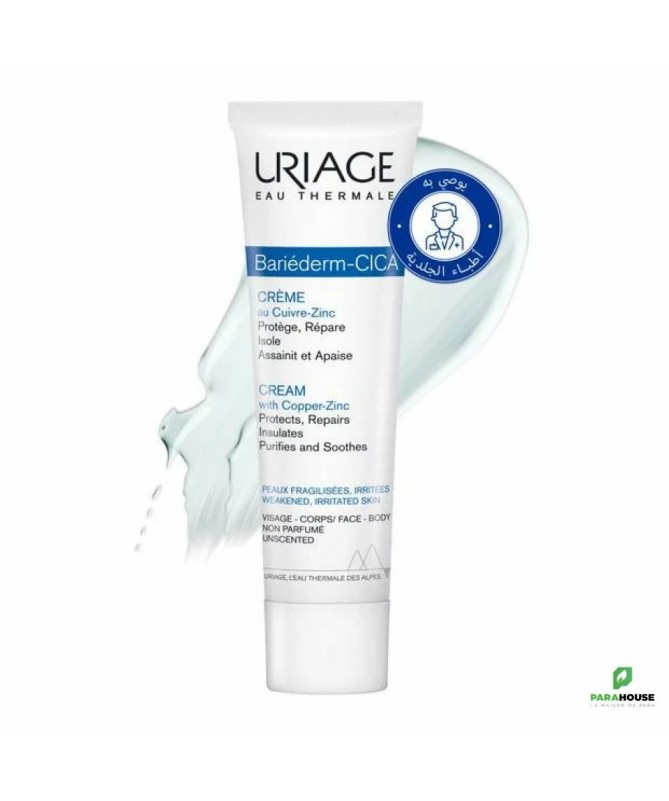 URIAGE BARIEDERM CICA CREME AU CUIVRE ZINC 100ML Uriage Bariéderm Cica creme au cuivre zinc est une crème protectrice et réparatrice est le soin idéal pour les peaux fragilisées à la suite d'agressions diverses : démangeaisons, échauffements, post-actes dermo-esthétiques, tatouages... Uriage bariederm cica creme au cuivre zinc : Isole et protège: Le Brevet Poly-2P créé un "effet pansement" immédiat non-occlusif pour isoler et protéger la peau des agents extérieurs. Répare: Le Complexe breveté GF-Repair stimule les facteurs de croissance pour favoriser la réparation de l’épiderme. Assainit et apaise: L'Eau Thermale d'Uriage associé au D-Panthénol apaise immédiatement et durablement les irritations et sensations d'inconfort. Le Cuivre Zinc limite le risque de prolifération bactérienne. Composition: Eau Thermale d’Uriage Cuivre-Zinc Poly-2P Smectite GF-Repair D-Panthénol Acide hyaluronique Silicium organique Hypoallergénique Sans parfum Sans conservateur AQUA (WATER, EAU) — PARAFFINUM LIQUIDUM (MINERAL OIL) — SODIUM CHLORIDE — ZINC OXIDE — CETYL PEG/PPG-10/1 DIMETHICONE — PROPYLHEPTYL CAPRYLATE — BUTYLENE GLYCOL — HYDROGENATED POLYDECENE — PANTHENOL — GLYCERIN — DIMETHICONE — DISTEARDIMONIUM HECTORITE — POLYGLYCERYL-3 DIISOSTEARATE — MAGNESIUM SULFATE — METHYLPROPANEDIOL — TOCOPHERYLACETATE — TRIACONTANYL PVP — COPPER GLUCONATE — PROPANEDIOL — PROPYLENE CARBONATE — CITRIC ACID — GLUTAMYLAMIDOETHYL INDOLE — POLYQUATERNIUM-61 — HYALURONIC ACID — SILANETRIOL — BORAGO OFFICINALIS SEED OIL — TOCOPHEROL Conseils d'utilisation: Il est recommandé d'Appliquer BARIEDERM cica creme deux fois par jour sur une peau préalablement nettoyée avec le Bariéderm Cica-Gel Nettoyant. Bébés - Enfants - Adultes