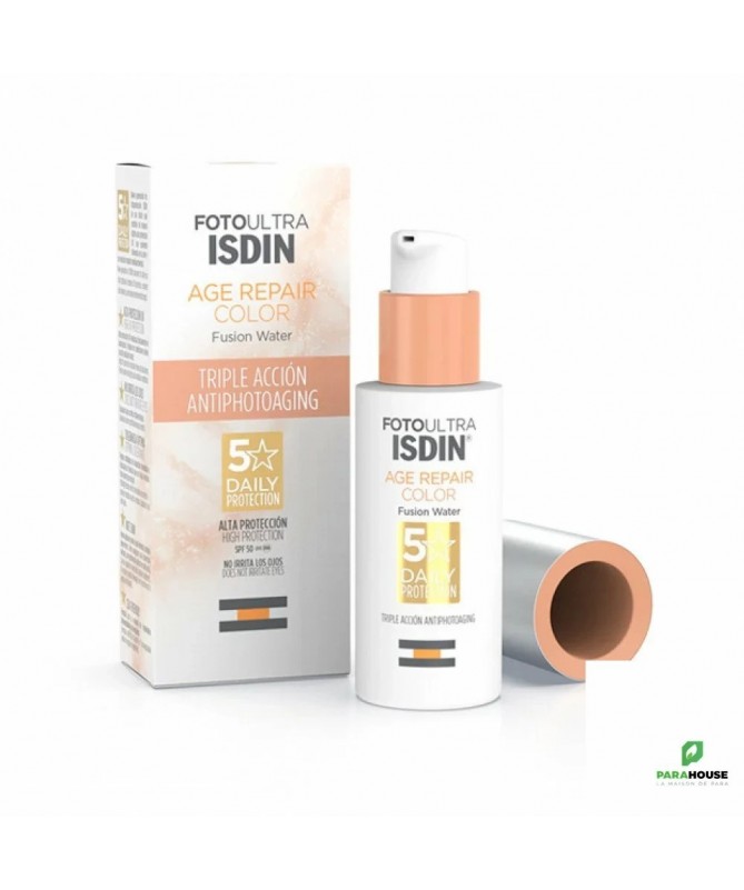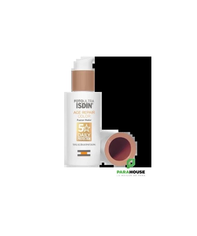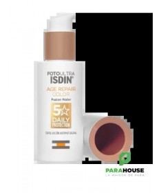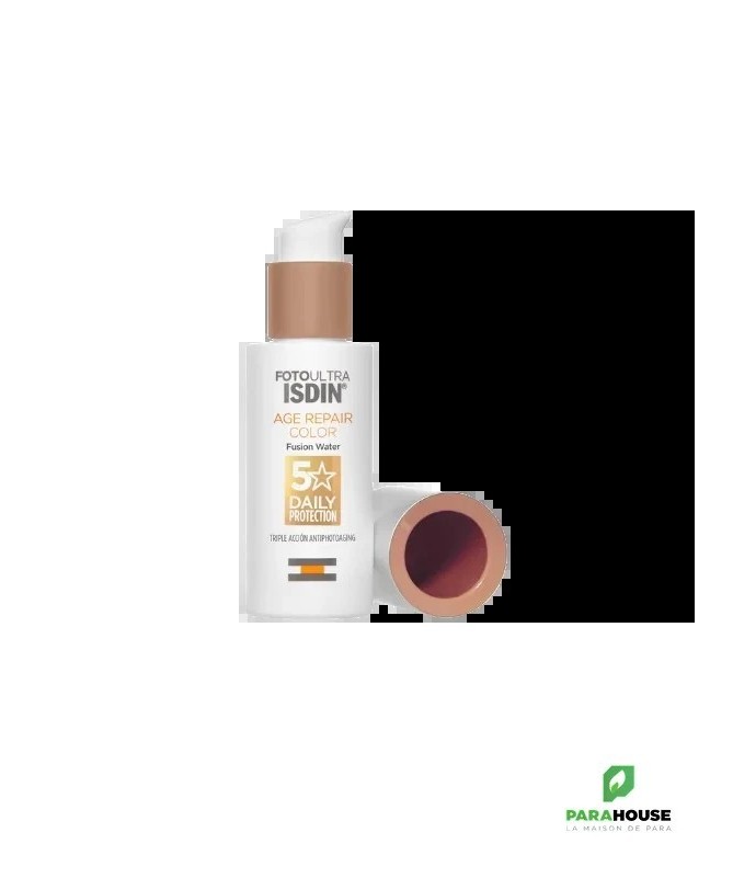 ISDIN Age Repair Color SPF50 50ML ISDIN Age Repair Color SPF50 est un écran solaire teinte et léger contre les UVB et les UVA qui aide à prévenir les dommages cellulaires causés par les rayons nocifs du soleil. ISDIN Age Repair color offre une couvrance naturelle qui unifie le teint et camoufle les imperfections, procurant un effet bonne mine. Non comédogène. Hipoallergénique : formulé pour minimiser les risques d'allergie. Avantages de ISDIN FotoUltra Age Repair Color SPF50 : Protection UV élevée qui aide à prévenir les dommages causés par le soleil. Protège la peau de la pollution urbaine. Favorise la réparation des dommages solaires accumulés au niveau cellulaire. Inverse les signes visibles du vieillissement, stimule notre propre synthèse de collagène et réduit les rides tout en améliorant la luminosité de la peau. Composition : Aqua (Water), Octocrylene, Propanediol, Butyl Methoxydibenzoylmethane, Ethylhexyl Salicylate, Polymethyl Methacrylate, CI 77891 (Titanium Dioxide), Phenylbenzimidazole Sulfonic Acid, Polysilicone-15, Caprylic/Capric Triglyceride, Hydrogenated Polydecene, Propylene Glycol Dicaprylate/Dicaprate, , Glycerin, Bis-Ethylhexyloxyphenol Methoxyphenyl Triazine, Silica, CI 77492 (Iron Oxides), Butylene Glycol, 1,2-Hexanediol, Hydroxyacetophenone, Magnesium Aluminum Silicate, Polysorbate 60, Disteardimonium Hectorite, Caprylyl Glycol, Tocopheryl Acetate, Xanthan Gum, CI 77491 (Iron Oxides), Propylene Carbonate, CI 77499 (Iron Oxides), Disodium EDTA, Parfum (Fragrance), Aluminum Hydroxide, PEG-8, Sodium Lauroyl Glutamate, Carbomer, Polysorbate 20, Sodium Lactate, Lysine, Tocopherol, Magnesium Chloride, Phenoxyethanol, Lecithin, Plankton Extract, Ascorbyl Palmitate, Sodium Benzoate, Ascorbic Acid, Citric Acid, Palmitoyl Tripeptide-1, Palmitoyl Tetrapeptide-7, Pentapeptide-34 Trifluoroacetate. Conseils d'utilisation : Il est recommandé d'appliquer d'appliquer ISDIN Age Repair Color généreusement sur peau sèche ou humide, trente minutes avant l'exposition au soleil. Renouveler l'application de ISDIN Age Repair teinte toutes les 2 heures et après avoir transpiré, nagé ou s'être essuyé avec une serviette. Si une quantité inférieure est appliquée, le facteur de protection est inférieur. Gardez les bébés et les enfants à l'abri de la lumière directe du soleil. Eviter le contact avec les yeux et les muqueuses. Gardez le produit hors de portée des enfants. Ne pas mettre au réfrigérateur ni au congélateur.