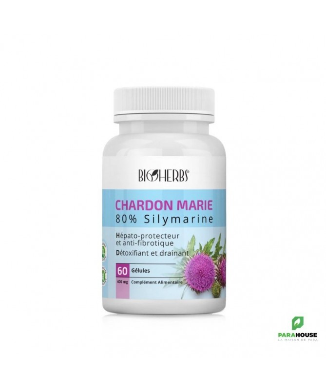 Description :Le Chardon Marie, également connu sous le nom de Silybum marianum, est une plante médicinale qui est originaire de la région méditerranéenne et de certaines parties de l'Europe.Cette plante tire son nom de ses feuilles épineuses et de ses graines qui contiennent un composé actif appelé silymarine. Le Chardon Marie est apprécié pour ses bienfaits pour la santé du foie.Il est souvent consommé sous forme de supplément alimentaireBienfaits :Soutien à la santé du foieDétoxification du foieRéduction de l'inflammationSoutien digestifRéduction du cholestérolSoutien à la santé de la peauSoutien contre les dommages oxydatifsConseils d’utilisations :1 Gélule 2 fois par jour après les repasPrécautions d’emploi :Ne pas dépasser les doses journalières indiquéesNe doublez jamais une dose pour compenser une dose oubliéeSi vous oubliez de prendre une dose, prenez-la le plus tôt possible, sauf si c'est près de l'heure de la dose suivante, alors la dose oubliée sera sautée et la dose suivante sera prise à l'heure spécifiéeLes compléments alimentaires ne peuvent en aucun cas se substituer à une alimentation variée et équilibréeSi vous suivez un traitement médical, il est indispensable de demander conseil à un professionnel de la santéConditions de conservation :Conserver dans un endroit sec, à l'abri de l'humidité, à une température inférieure à 25° C et hors de portée des enfants.Composition :Extrait de Chardon marie (Silybum marianum) titré à 80% de Silymarine