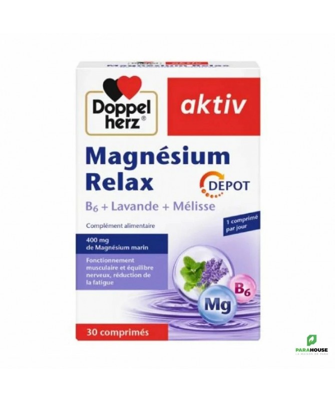 AKTIV MAGNESIUM RELAX 30 Comprimes AKTIV MAGNESIUM RELAX associe du magnésium aux vitamines B6, B1 et à la niacine, pour une action combinée sur le fonctionnement du système nerveux et la réduction de la fatigue. La vitamine D contribue, tout comme le magnésium, à une fonction musculaire normale. Doppelherz aktiv Magnésium Relax contient également un extrait de mélisse et de l’huile de lavande. Ces deux plantes originaires du bassin Méditerranéen sont connues en phytothérapie et aromathérapie pour leur action apaisante douce et sont utilisées notamment en cas de stress et de problèmes d’endormissement. Grâce à la technologie DEPOT, les comprimés libèrent les nutriments de manière progressive, laissant ainsi à l’organisme le temps de les assimiler plus efficacement. La prise quotidienne d’un comprimé de Magnésium Relax assure des apports optimaux en magnésium, niacine et vitamines B6, B1 et D, pour soutenir le fonctionnement nerveux et musculaire et favoriser la détente propice au bien-être général. Composition : Magnesium 400 mg Vitamin D3 5 µg Vitamin B1 1.1 mg Vitamin B6 1.4 mg Niacin 16 mg Melissa leaves extract 100 mg Lavender oil 5 mg Oxyde de magnésium, carbonate de calcium (agent de charge), hydroxypropylméthylcellulose (agent d'enrobage), extrait de feuilles de mélisse (Melissa officinalis), dioxyde de silicium (antiagglomérant), mono- et diglycérides d’acides gras (antiagglomérant), cellulose en poudre (agent de charge), graisse de palme (entièrement hydrogénée), nicotinamide, sels de magnésium d'acides gras (anti-agglomérant), isomalt (agent de charge), maltodextrine, gomme arabique (agent de charge), talc (anti-agglomérant), huile de lavande (Lavandula angustifolia), cholécalciférol (vitamine D3), chlorhydrate de pyridoxine (vitamine B6), triglycérides à chaîne moyenne et chlorhydrate de thiamine (vitamine B1). Sans gluten Sans lactose Conseil d'utilisation : Prendre un comprimé par jour au repas avec suffisamment de liquide sans mâcher. Ne pas dépasser la posologie quotidienne recommandée. Les compléments alimentaires ne peuvent pas se substituer à une alimentation équilibrée et variée. Tenir hors de la portée et de la vue des enfants. La consommation de plus de 250 mg de magnésium peut avoir des effets laxatifs pour les personnes sensibles. Ce produit ne convient ni aux enfants, ni aux adolescents, ni aux femmes enceintes ou aux femmes allaitantes. A conserver à une température inférieure à 25 °C.